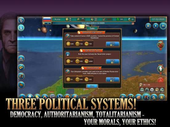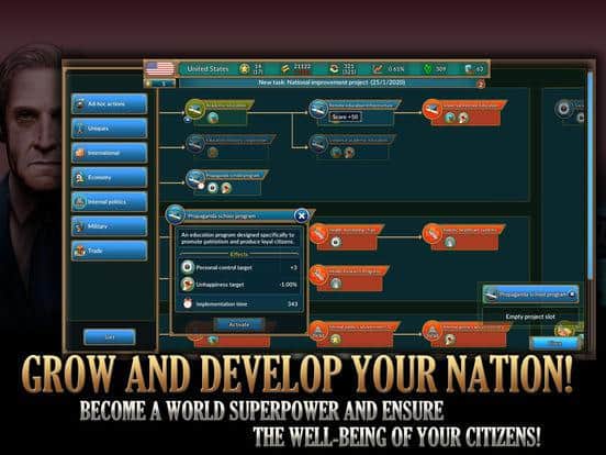 Realpolitiks Mobile turn based strategy game for IOS where you play the role of the President. Your main task in this game will lead their country to dominance and prosperity. Engage in diplomacy to solve political and economic issues, and use espionage to find out necessary information about other countries. Improve your army and economy, and decide what countries you will lead the Alliance, and with which to enter the war. Create nuclear weapons and threaten other States, achieving influence throughout the world. Become a politician and achieve incredible results.