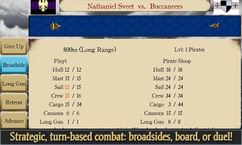 Studio developer Cory Trese well known to mobile gamers, thanks to its space series of role-playing games. The uniqueness of the series lies in the fact that the developers have managed quite harmoniously combine the elements of classic role-playing games and real time strategy. Combining elements of Economics, strategy, development, politics, social elements, designed combat system all this has allowed be of interest to a fairly wide audience. Age of Pirates RPG Elite is a continuation of the series preserved all the basic elements, but this time the developer decided to turn its attention to the era of the great geographical discoveries. So if you like sailing boats, long journeys, pirates, raids, thus you are a fan of slow turn based gameplay, then this game is for you.
