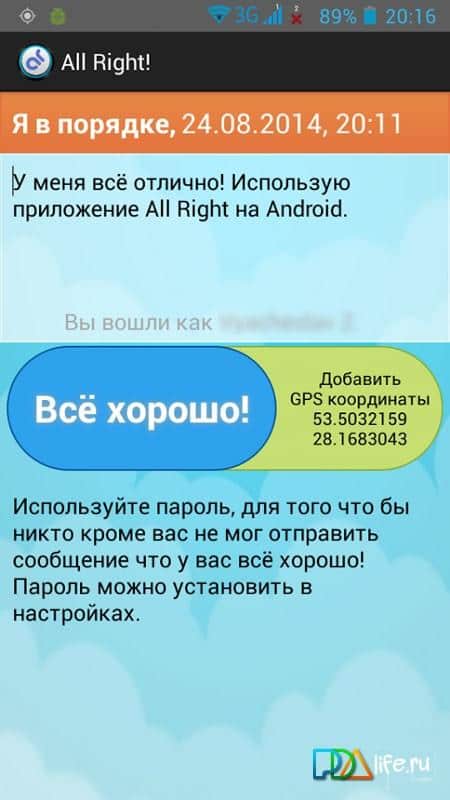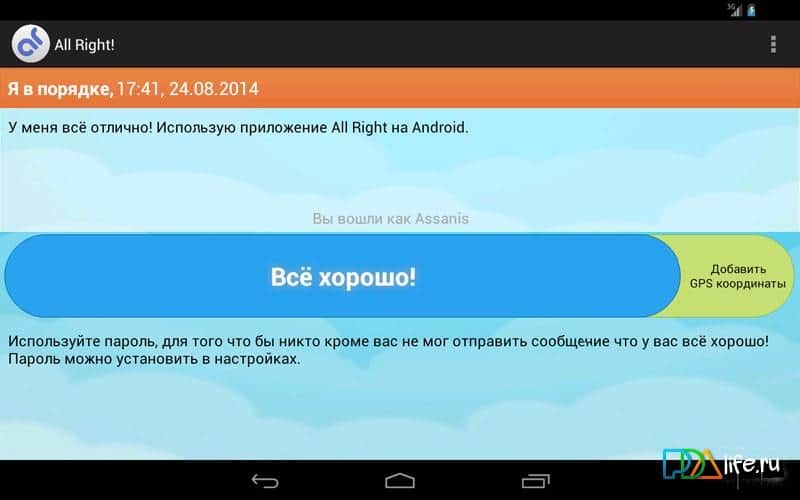 All Right! – отличное приложение для тех, кто много путешествует и бывает далеко от дома. Ваши родные и близкие будут спокойны за вас, если вы скачаете и установите данное приложение, благодаря которому вы сможете сообщать, что у вас все хорошо. Приложение All Right! будет не заменимо при отсутствии Wi-Fi, окончании средств на счету телефона. Отправляйте сообщения о своем благополучии и они будут публиковаться в Тwitter, так же есть возможность информирования о своих GPS координатах.