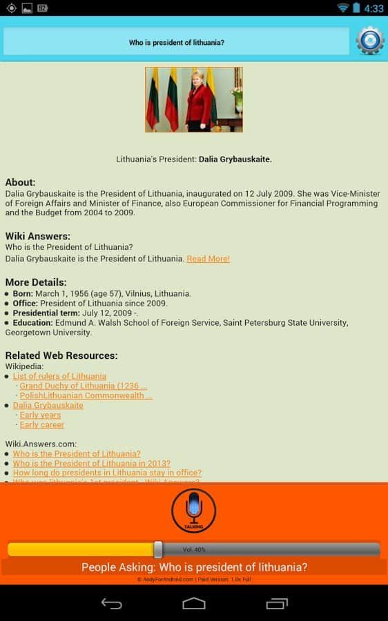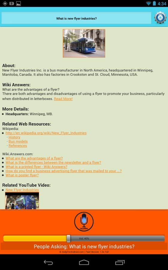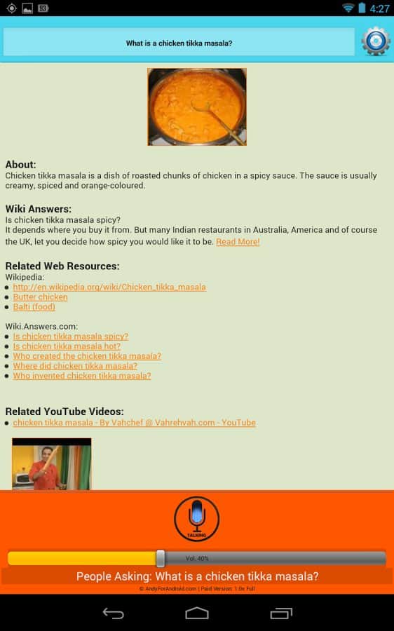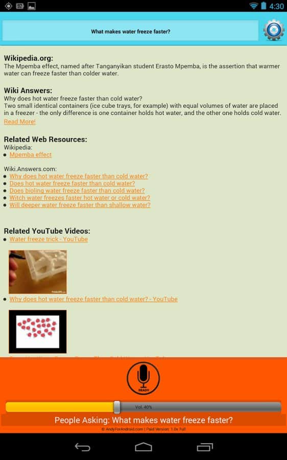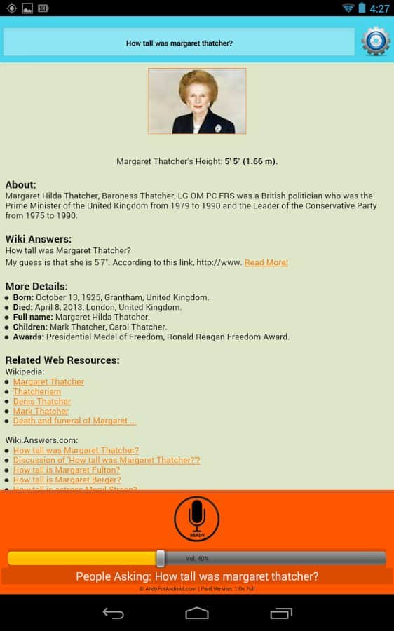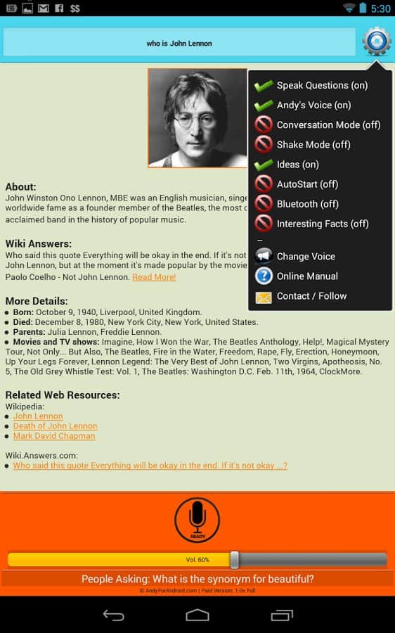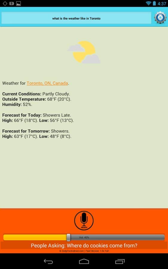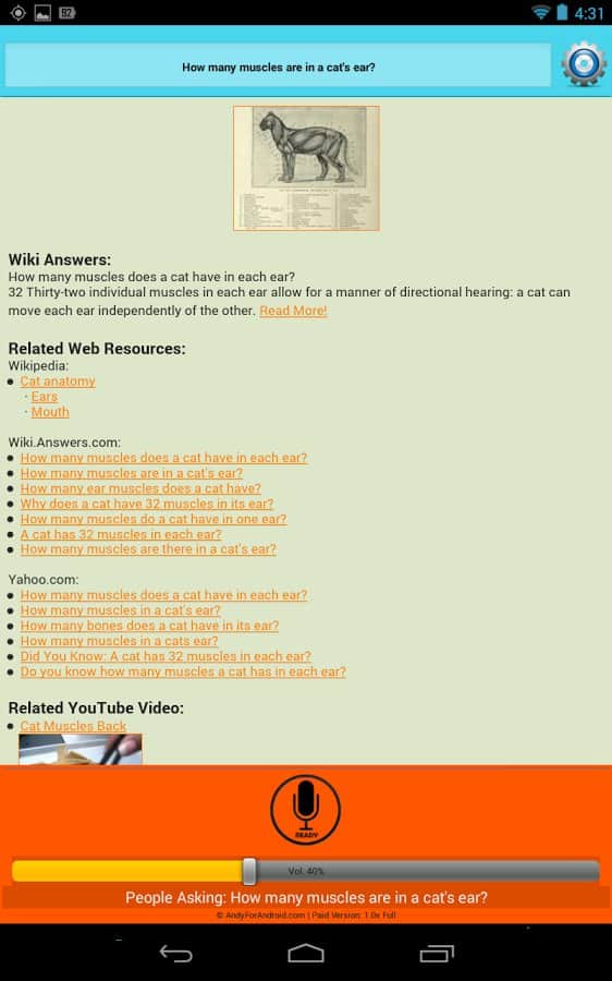 ANDY Voice Assistant Is Andy voice assistant is like Siri, only for Android. This application is very simple but works well. Your helper not only finds the information he is looking for her, and begins to read it to you. If you don't like the voice, you can always change it. Also, you can chat in type "question-answer". You can ask about some person and then to ask a question about education of this person, and your assistant will tell you, it does not need to repeat a hundred times about who exactly you are asking, the information is stored, and you continue a dialogue with this application. Very comfortable and practical, has multiple settings, and very happy.