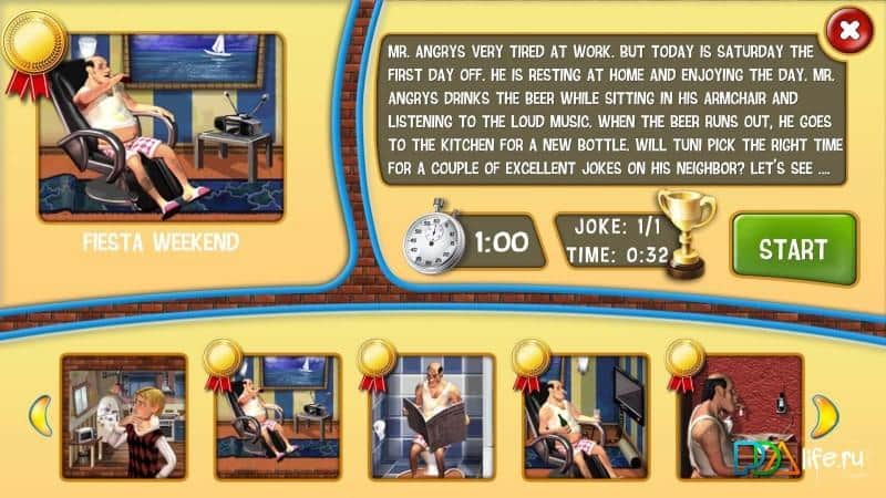Достань Соседа - Месть, Сладка - Увлекательная аркада, о том, как вы мстите своему соседу. Она отлично подходит для тех, кто любит снять стресс, расслабится, и устроить подлость давно надоевшему соседу. Принцип игры очень прост, вы ставите ловушки для соседа, он на них попадает. Если же вы попались ему на глаза, то вам всадят смачного пендаля, и отправят куда подальше, в итоге вы проиграете. Вам нужно сделать как можно больше шалостей, что бы получить очки. Так же все уровни в игре отличаются, и шалости которые вы должны будете сделать, тоже будут отличаться. Вы можете построить целую серию шалостей, что бы получить бонусные очки, и выйти не просто победителем, а ещё и довести своего соседа до нервного срыва. Ну что же, время пошалить!