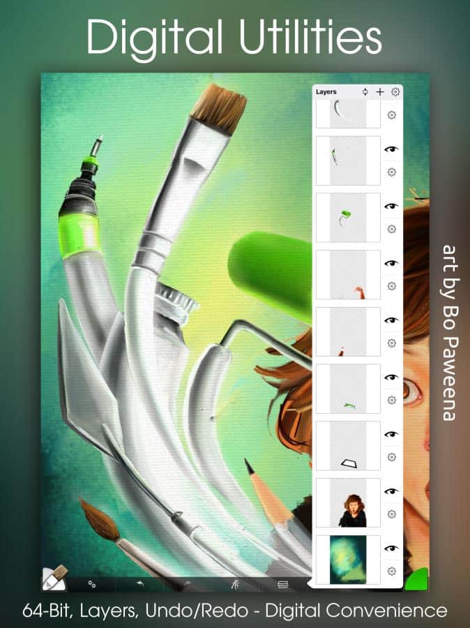 Here are the tools as close to the reality, and each of them has a set of appropriate settings. The number of layers is not limited, plus there are different blending modes.