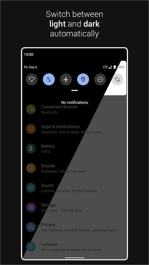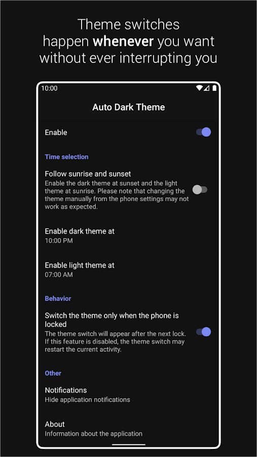 Automatic Dark Theme for Android 10 is an app that automatically switches dark and light themes device depending on the time of day or a certain time interval configurable by the user. Apply various simple settings on your Android 10 and enjoy timely and fully automated theme changing without your participation. Thus do not worry about high energy costs and poor condition of the battery. The app is safe and is lightweight at boot that allows you to use the phone without interruptions and disruptions.