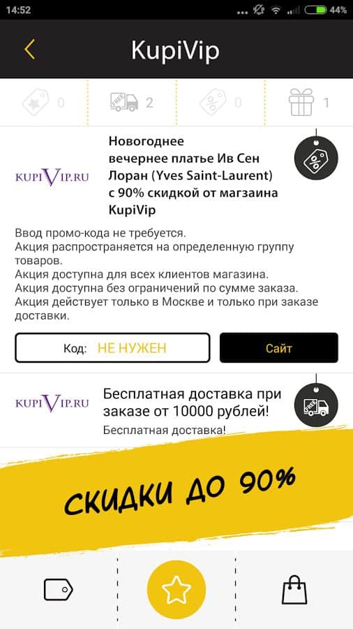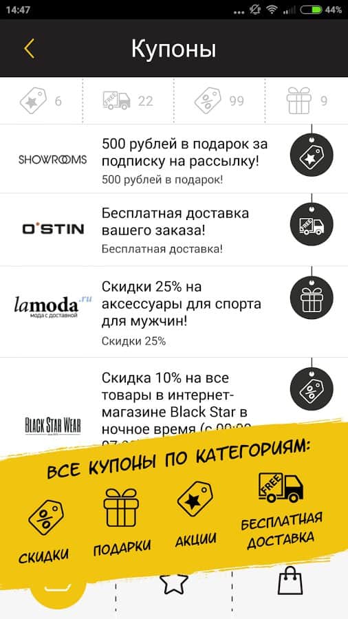 What to do when the "Day Hours"? Permanently delete the app until next year? In any case – after BlackFriday app allows you to keep track of all online promotions: you will always be updated on the most current discounts and sales. With this program, you will be able to collect and store all your promo codes for the selected category, to use them immediately via mobile Internet or to enter later on the desktop version of sites.