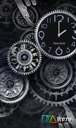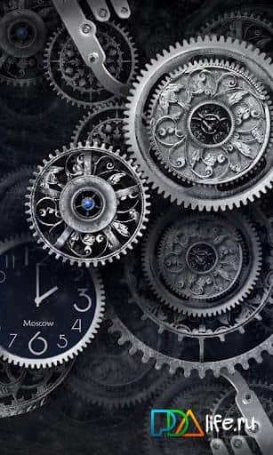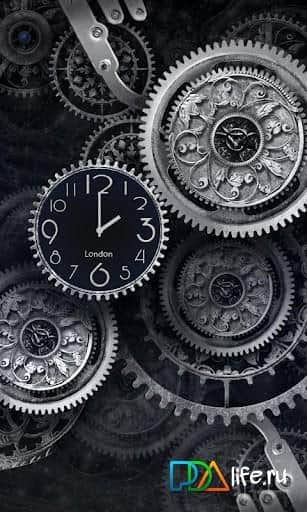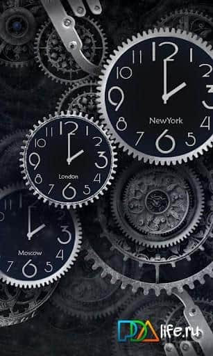 Black world time clock theme - unusual live Wallpaper will add to your desktop Your smartphone from 3 classic dial, which displays world time. Made very good can be considered part of the mechanism, bolts and miscellaneous gear. Made into a kind of Gothic style and certainly are “miracle-chimes” will appeal to lovers of the classics.