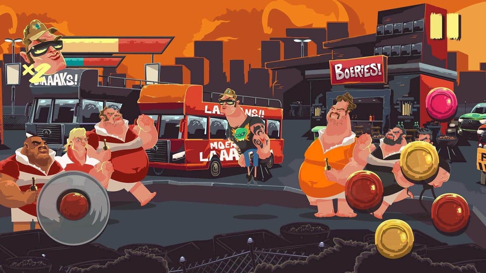 Boet Fighter – a 2D platformer for Android, with side scrolling. In this game you will take control of a brave and strong hero who has a bench press of 150 kg. Our hero must fight his way through Johannesburg and to complete the quests in order to remain a legend in the eyes of the public. Clear your way through the hordes of enemies that don't mind to fight with you and put them all on the shoulder. Upgrade and improve your character during the game and apply to it some chemicals which enhance its performance. Also, this game is a good way to learn a lot of South African slang.