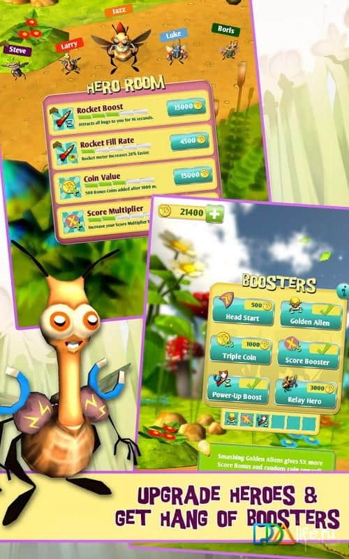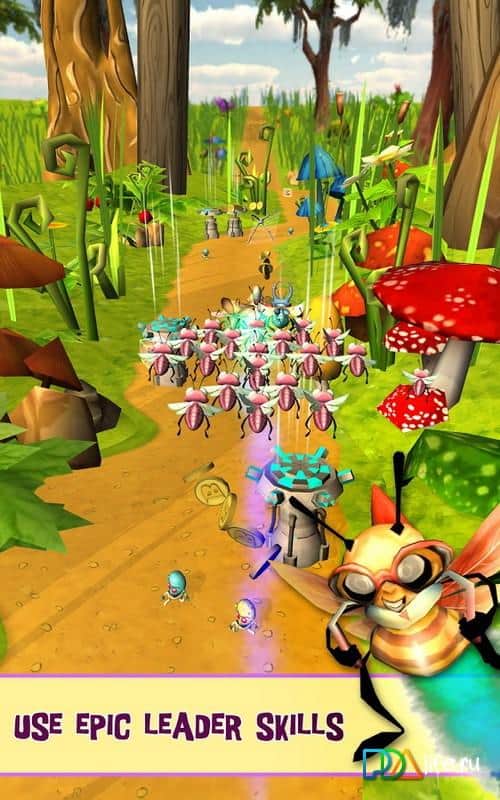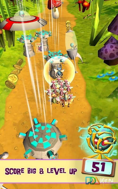 Bugs vs. Aliens - интересная аркада на андроид, в которой вы будете помогать насекомым, справится с инопланетными захватчиками. Отправляйтесь в захватывающее приключение, где будете уничтожать, врагов используя для этого различные бонусы и оружие такое как: плазменные лучи, ловушки и бомбы. Также вашей задачей будет собирать по пути своего следования монетки, и освобождать из плена маленьких букашек. Игра порадует вас яркой графикой, интересным геймплеем и разнообразными врагами.
