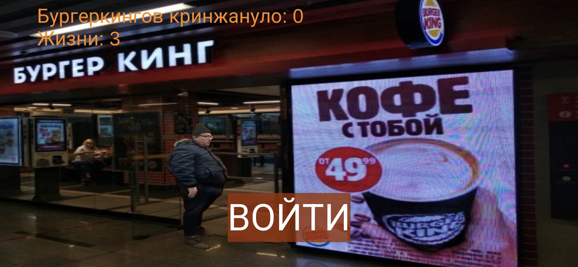 A security guard from one of the Burger Kings is hunting you, but there's no need to be afraid of being caught, as you'll still have to run away and hide from him. Just tap the phone screen frequently to maintain a normal level on the scale, because if it drops below normal, the guard will immediately catch you and take you away. Earn points, shout the well-known phrase, fend off with packets, and try not to waste all your lives in vain. See for yourself how many times Burger King cringes right in front of you.