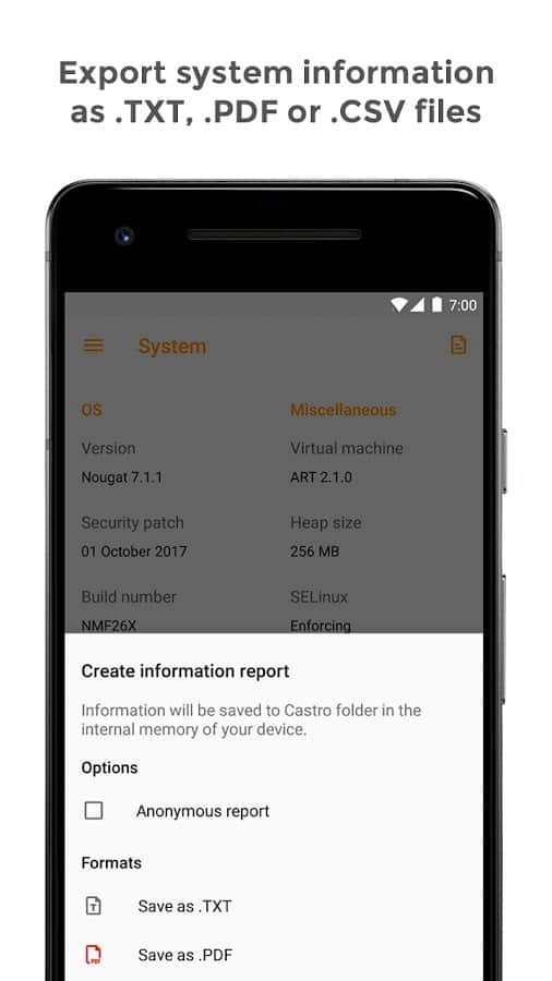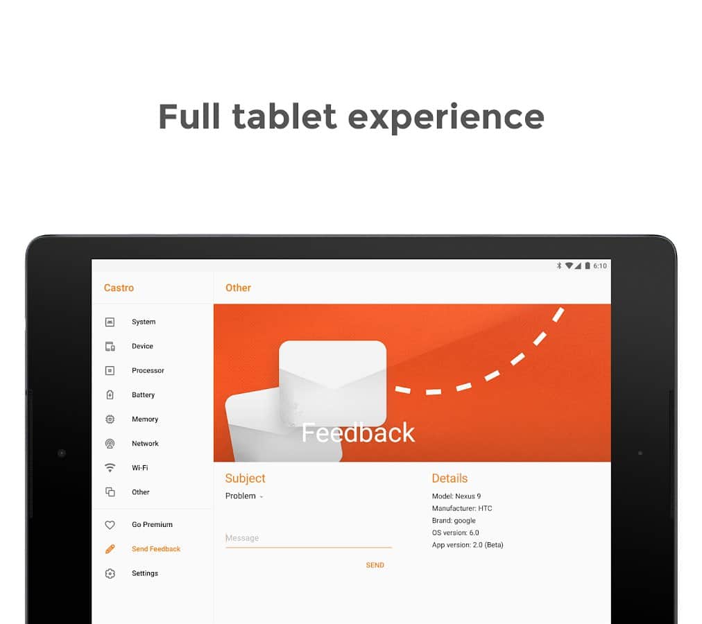 Castro в режиме реального времени показывает загруженность процессора и его основные характеристики, состояние оперативной и постоянной памяти, данные о мобильных сетях, Wi-Fi, состоянии аккумулятора и его возможном нагреве и многое другое.