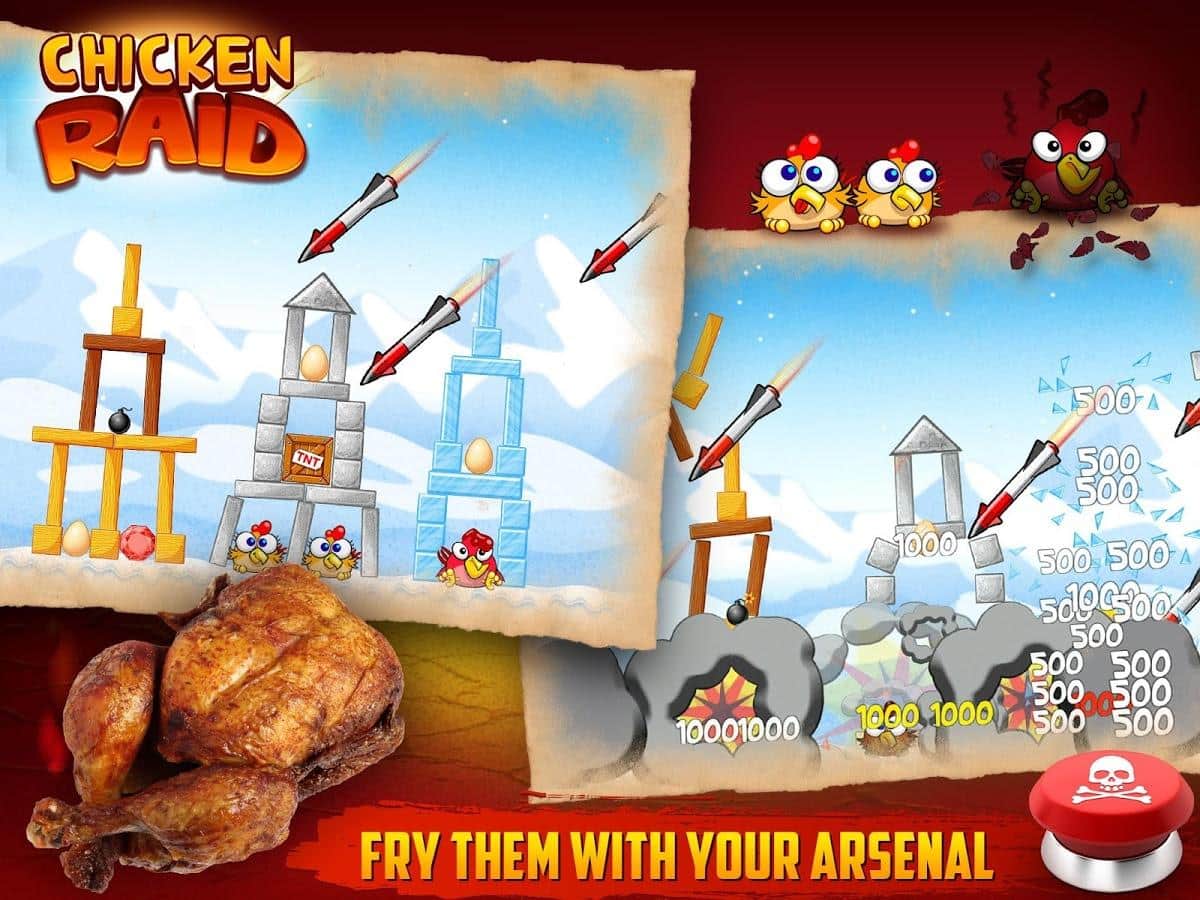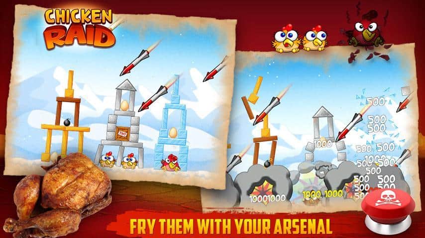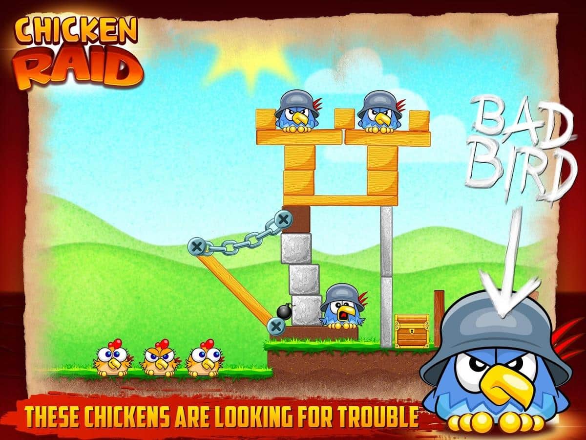 Chicken Raid - a bright arcade game for Android - its-kind Angry Birds clone. A gang or gang, call it what you want, cocky and arrogant chickens attacked your territory. These bullies behave disgusting and not going to leave. But you can not miss! Find the weak spots in buildings in which chickens have fun and try to get there, thus causing a chain reaction that destroyed the structure, and with it crushed Chicks. Use bombs and eventually unlock more interesting material that will add color to the gameplay! 96 levels of a unique scenario, and comics "Songs of chickens".