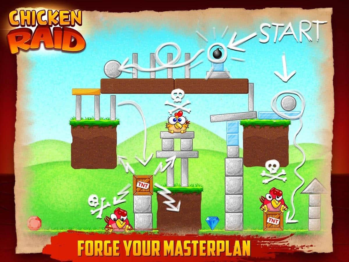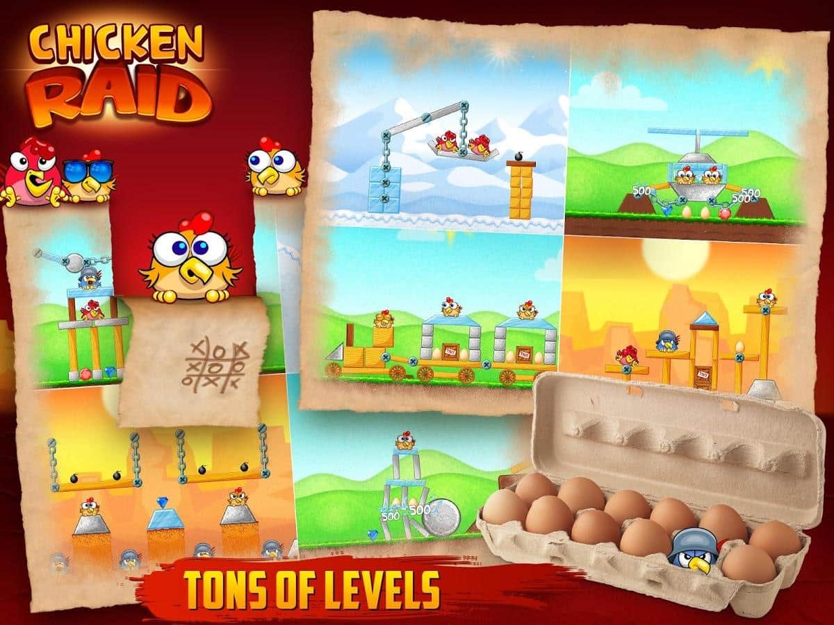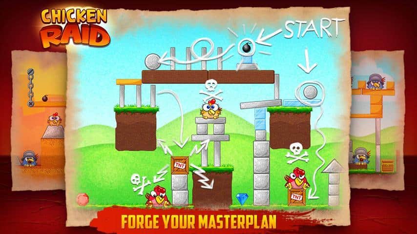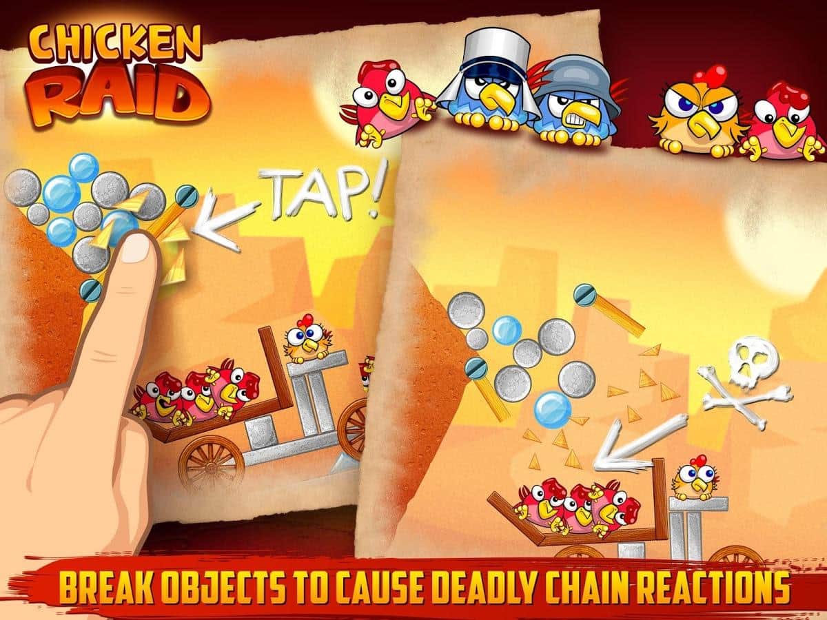 Chicken Raid - a bright arcade game for Android - its-kind Angry Birds clone. A gang or gang, call it what you want, cocky and arrogant chickens attacked your territory. These bullies behave disgusting and not going to leave. But you can not miss! Find the weak spots in buildings in which chickens have fun and try to get there, thus causing a chain reaction that destroyed the structure, and with it crushed Chicks. Use bombs and eventually unlock more interesting material that will add color to the gameplay! 96 levels of a unique scenario, and comics "Songs of chickens".