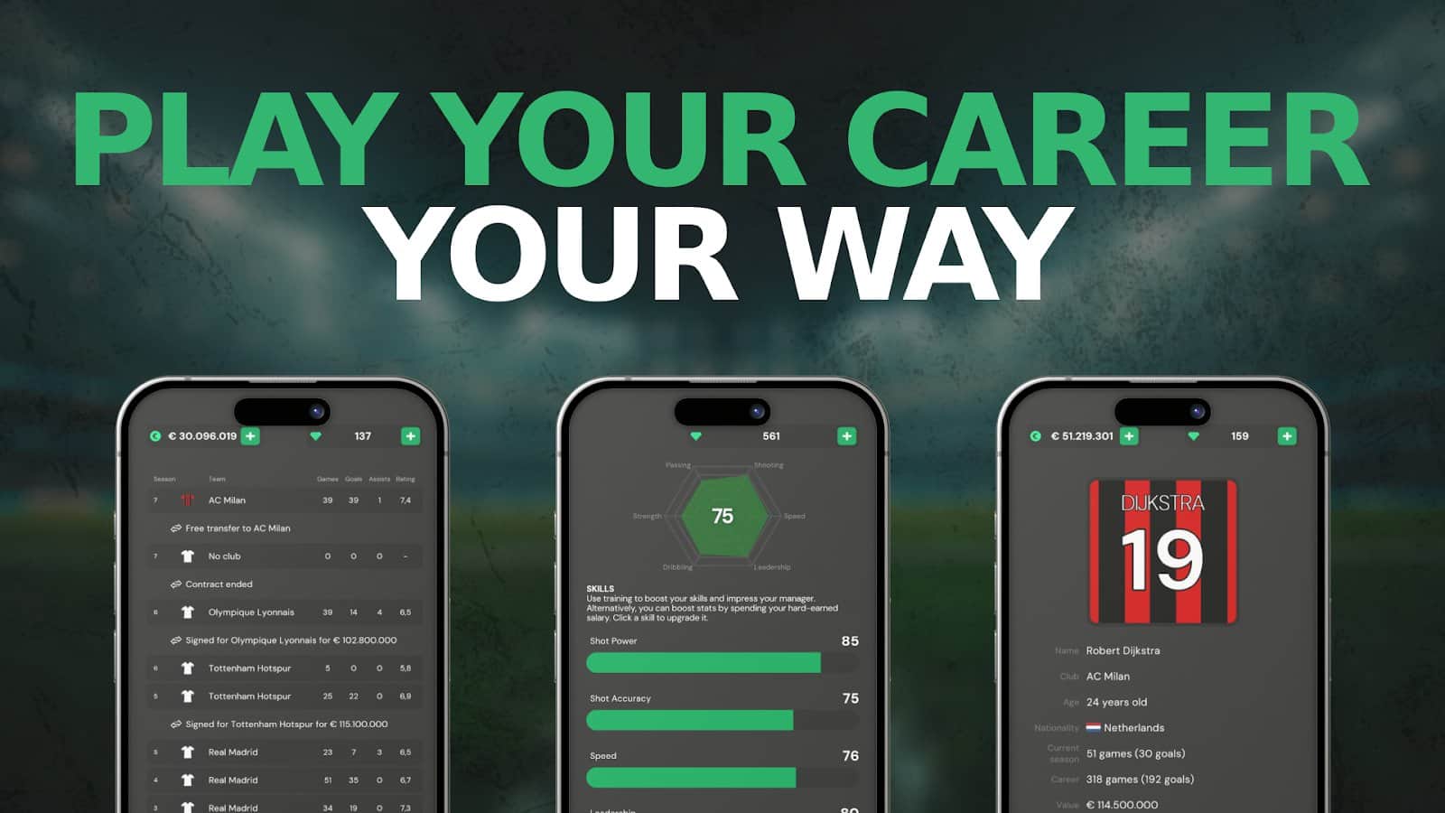 Club Legend - Football Game - The world of football legends in Club Legend. Here, your dreams of becoming a professional footballer will become a reality. Become a hero on the field, make goal assists, score goals, and lift trophies with your team. You will play in exciting matches in a realistic 2D football game engine, where you can showcase yourself as a true Lionel Messi or Andrea Pirlo. Win victories for your club and become real heroes of the field. But this is just the beginning of your path to glory. In Club Legend, you can move to the best clubs in the world thanks to a realistic transfer system. Impress scouts and sign a contract with the club of your dreams, whether it's "Liverpool" or "Barcelona.