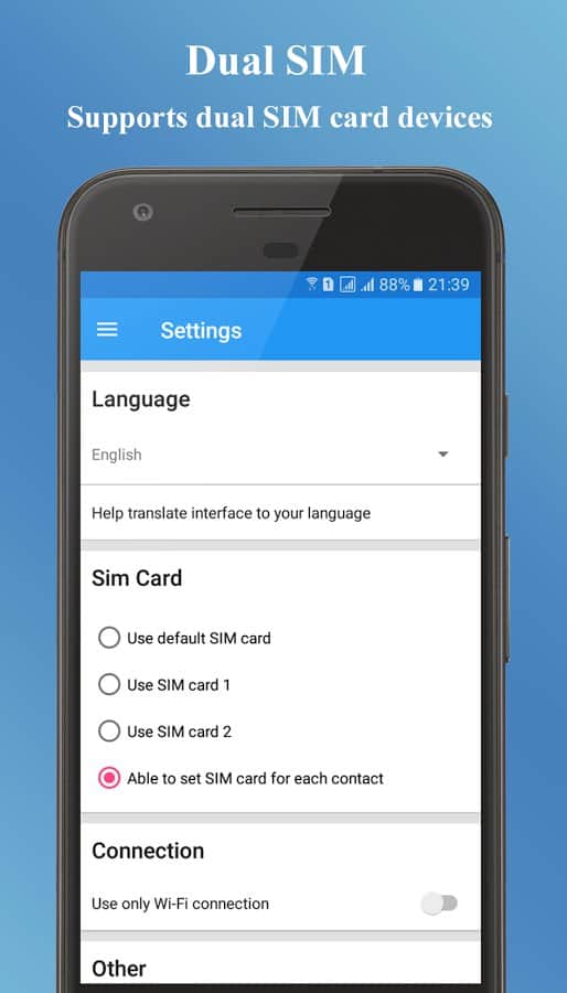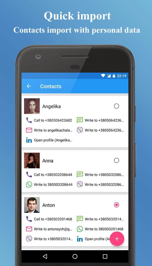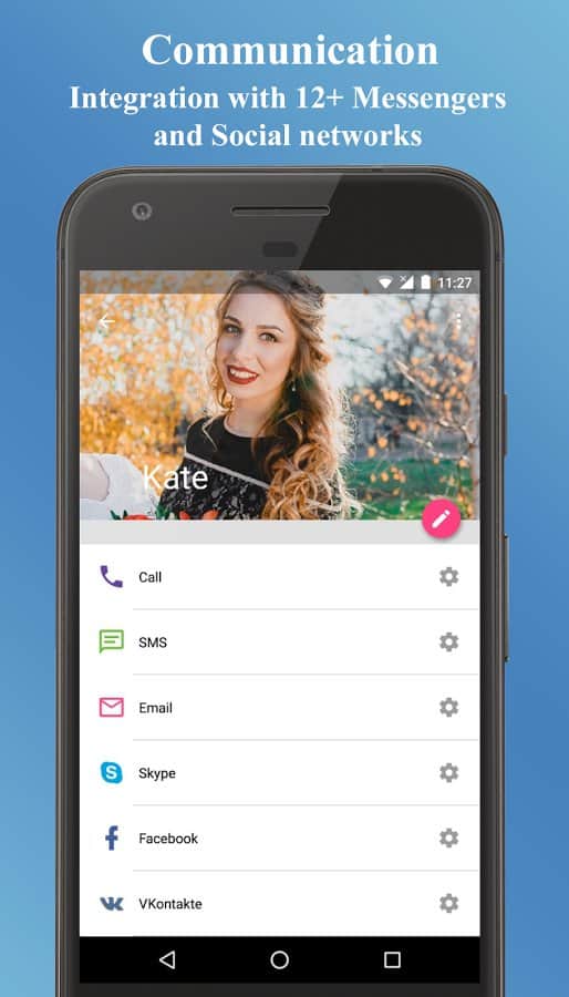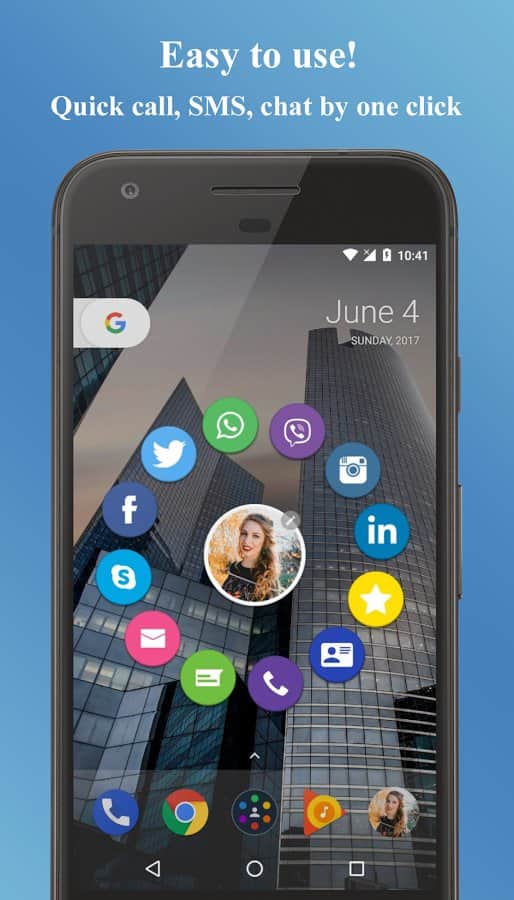 Quick access to the call functions, SMS sending, view profile and chat on social networks;