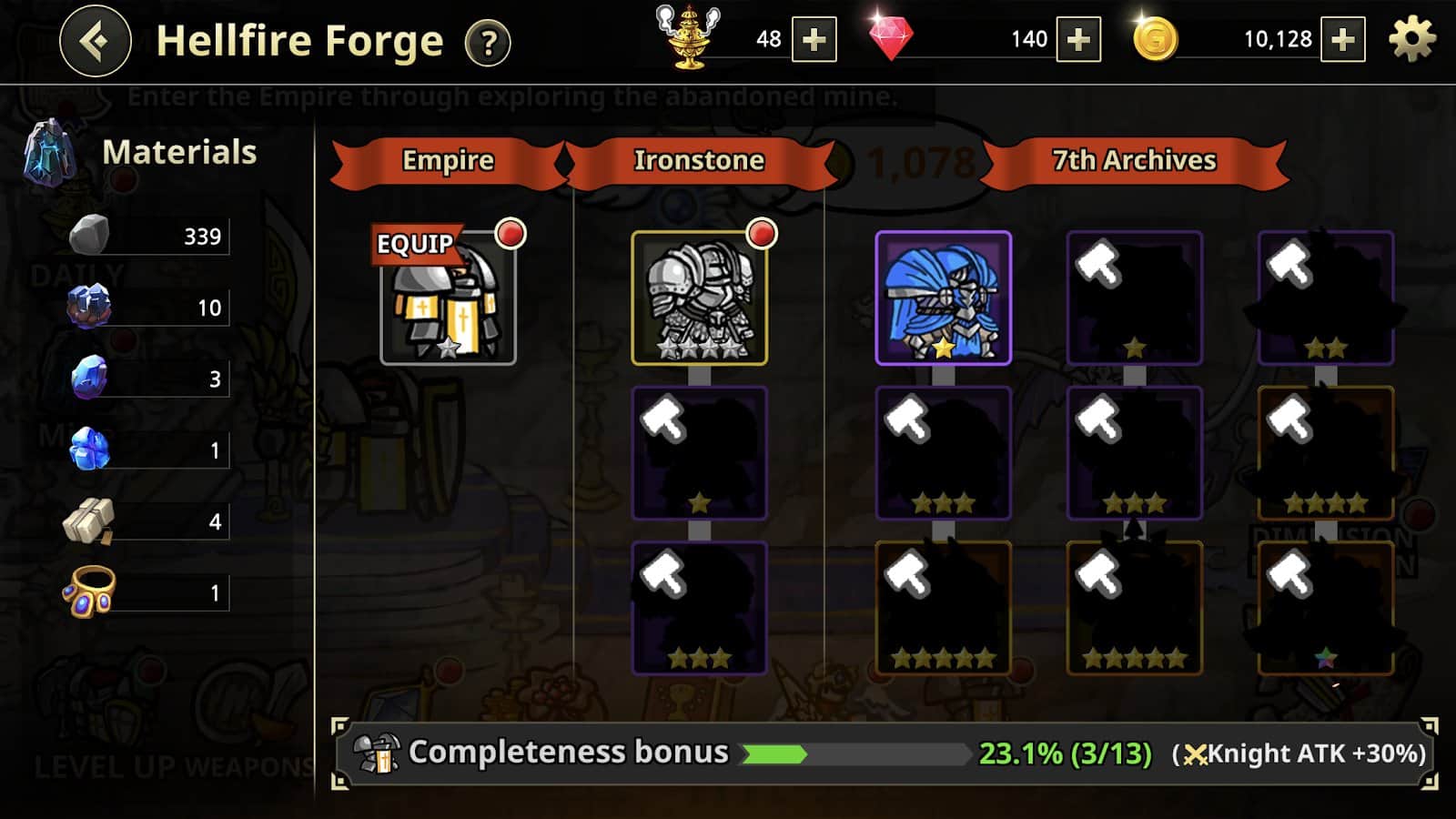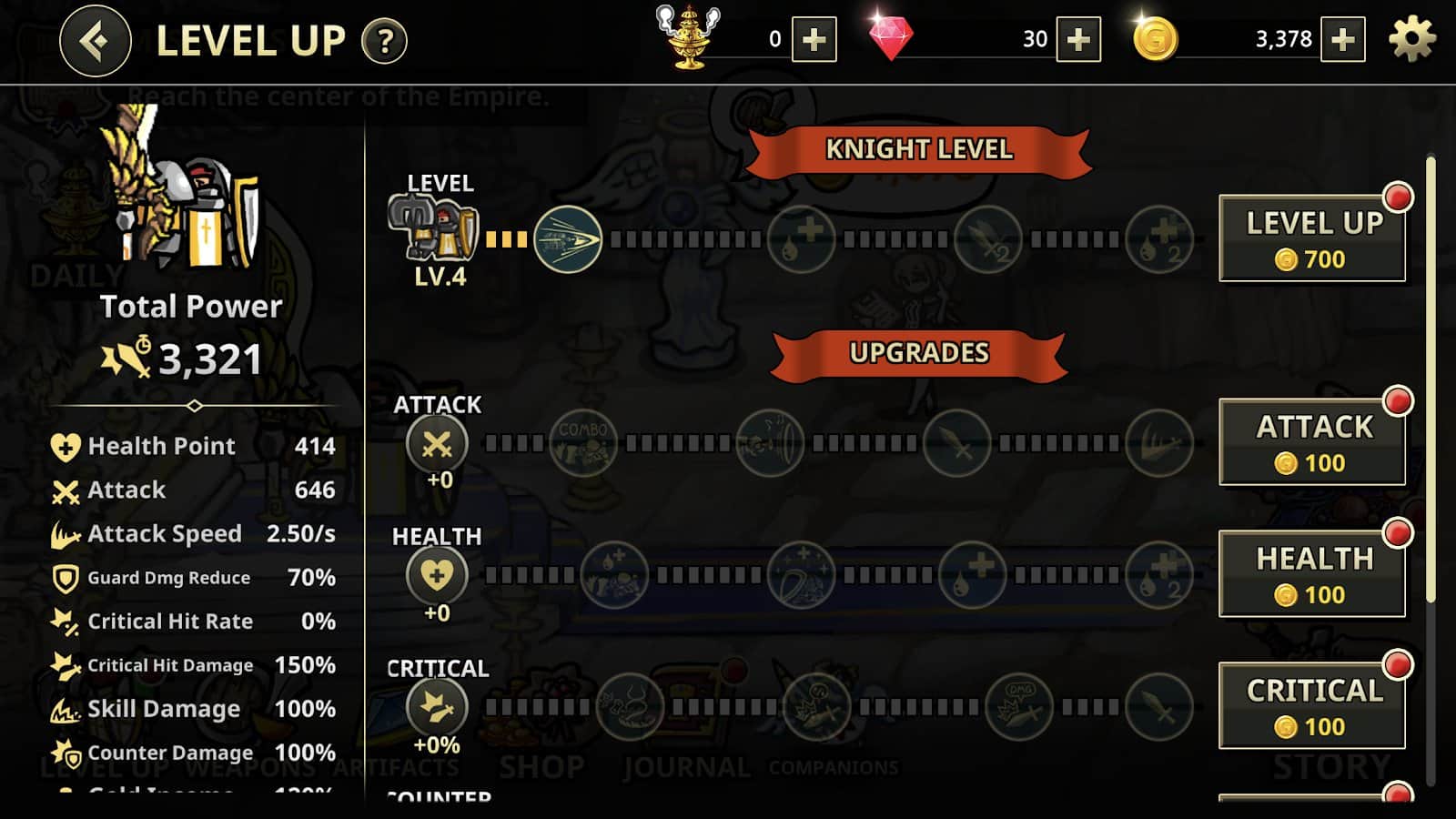 Character and weapon development. Level up the knight, train him in passive skills, and customize weapons for optimal combat effectiveness. You'll encounter numerous strategic opportunities.