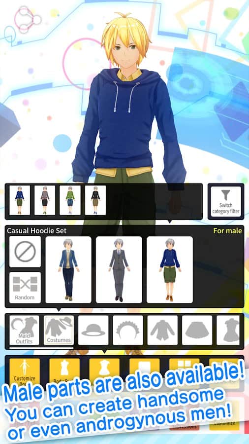 Try to create your own 3D anime character game-dress up CUSTOM CAST! Select your gender, name and start the process. You have a wide range of opportunities, which is divided into 2 parts: the body and clothing. In the category body you can: change the color of the skin, decrease/increase the nose, lips, ears, eyes, chin, to make longer or shorter legs and more. In the category of clothing you have: dresses, suits, bottom, top, accessories, shoes, bags and more. You can also change the background. Game feature: turns the character on all sides (helps to see all the details).