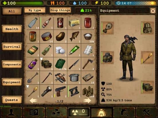 watch the exciting game for IOS where you will survive in a post nuclear apocalyptic world. This game will take you back in time to 1985, where the USSR was attacked by an invisible enemy and in a matter of days, destroyed the whole country by detonating a nuclear weapon. You are one of the few survivors after a terrible war and now you have to survive in this dangerous and broken world. The streets of many devastated towns wandering monsters and mutants and bandits who are greater danger. You will also be weary of illness, hunger, exhaustion and injuries. Explore the numerous wasteland and get a weapon and food. Try to survive in a race against death and not allow it to defeat you.