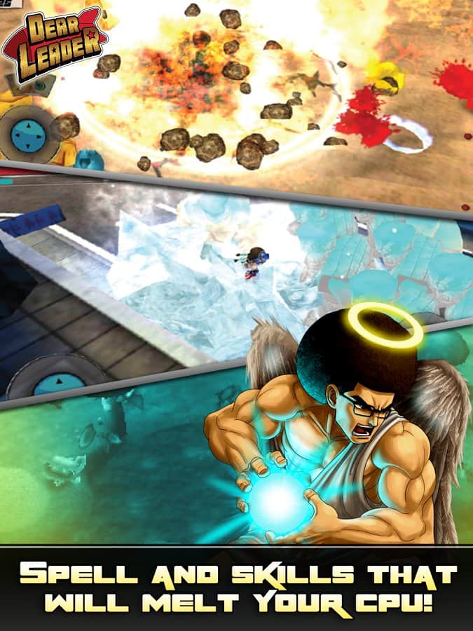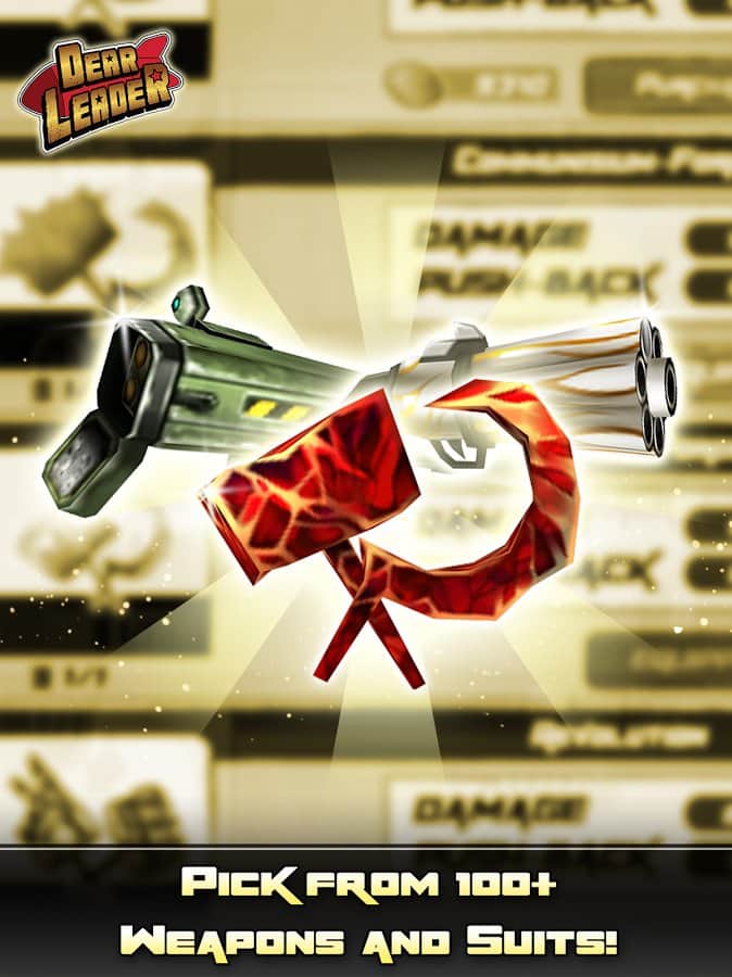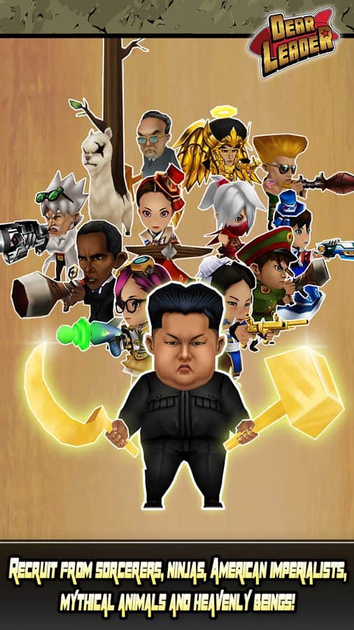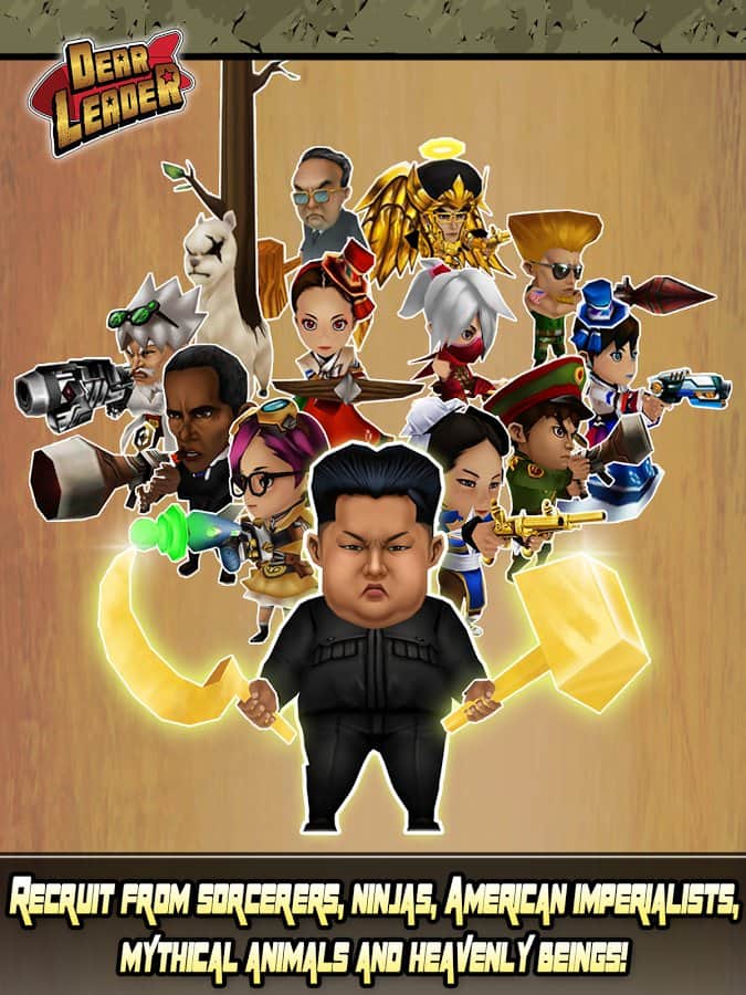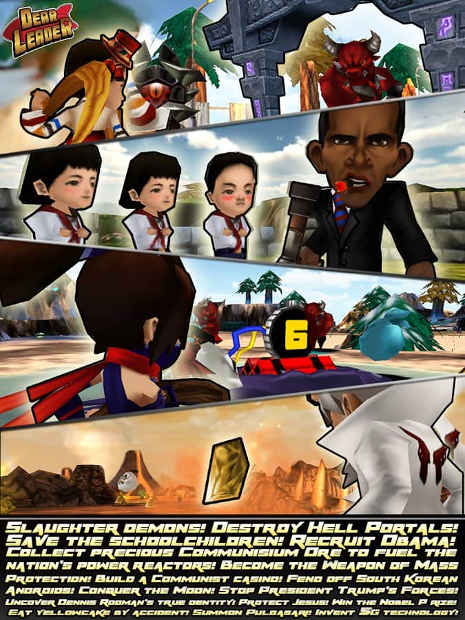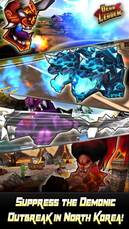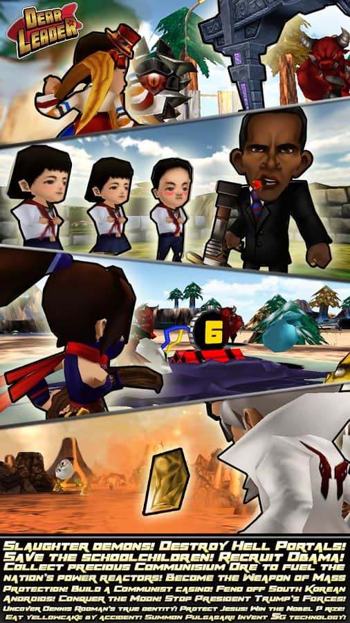 Dear Leader – a game on Android where you will help the North Korean leader to defeat the demons. In this game you will control Kim Jong Il and successor Kim Jong-UN, who need to protect their country and the world from the invasion threat of the demons. Armed with a sickle and a hammer, our hero engages in battle with hordes of enemies and destroy them one by one. Don't let the demons take over the world and protect civilians from them. Also in this game you will be able to use modern weapons and faster to destroy enemies. Invoke the aid of mythical creatures, ninjas, and other leaders of Nations.