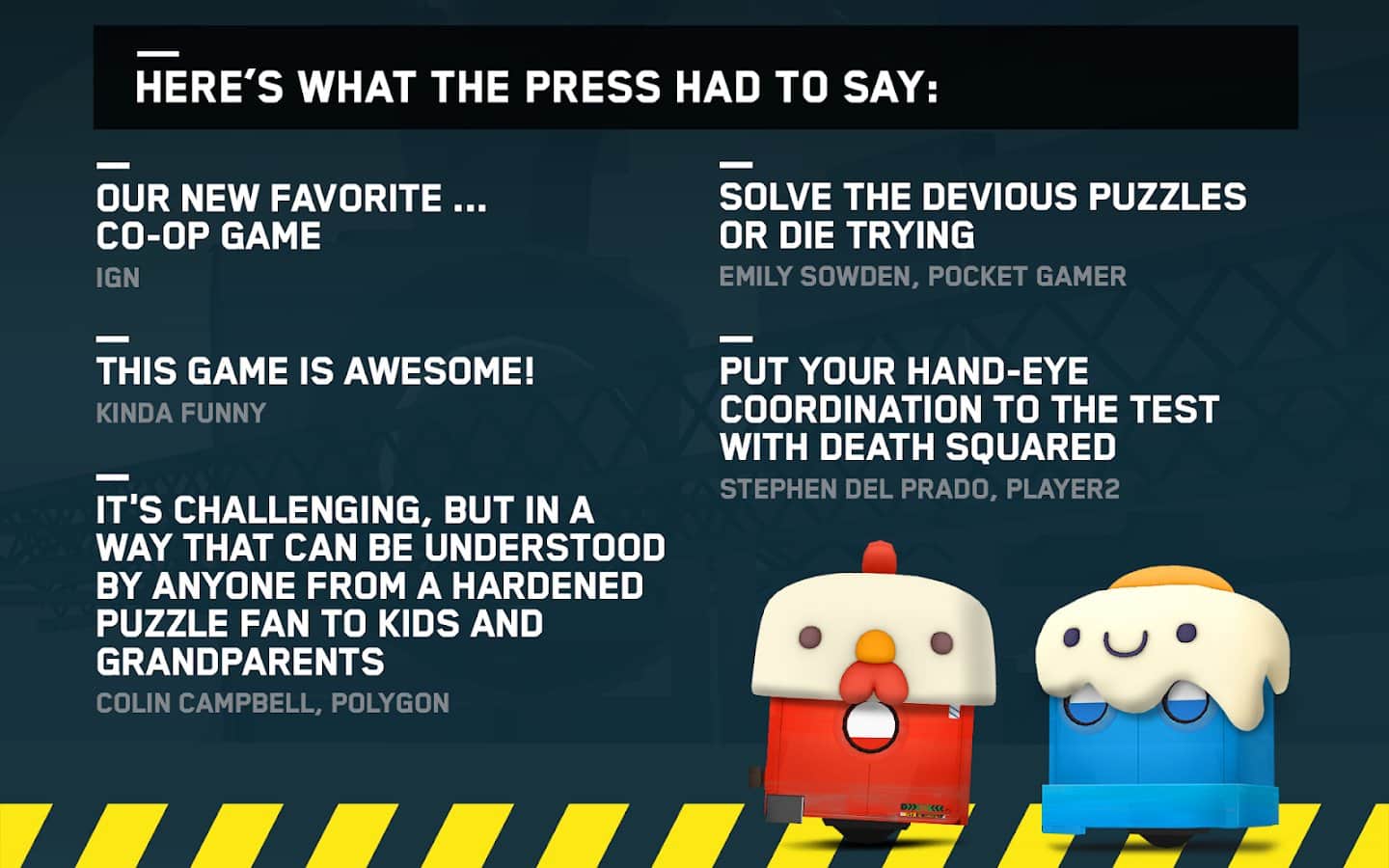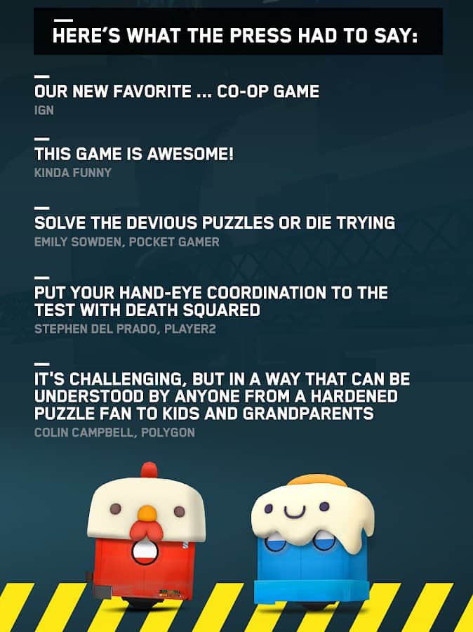 Death Squared – a dynamic puzzle game for Android in which you will be able to play with friends or by yourself controlling multiple characters. In this game your main task will be to navigate through the labyrinth and use unique abilities to pass certain tests. Rely on your coordination and speed of fingers & swipe through all the trials of brave heroes. Move from one maze to another, the complexity of which will gradually increase. The game features 80 unique levels, original soundtrack and hats for the characters.