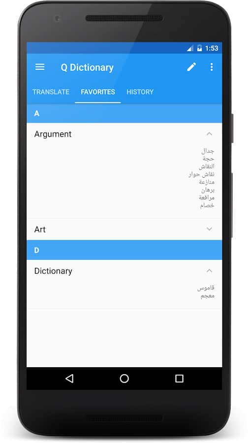 English Arabic Dictionary - You don't need to learn Arabic at all to be able to translate it into your own language, it's better to use this useful translator from Arabic to English with a lot of words and meanings! When choosing a certain word, you can view any information about it: meaning, type, usage examples, synonyms, correct sound, etc. Add the found words to bookmarks or simply copy the translation, and also use voice input to search for the necessary words in one of the two languages presented.