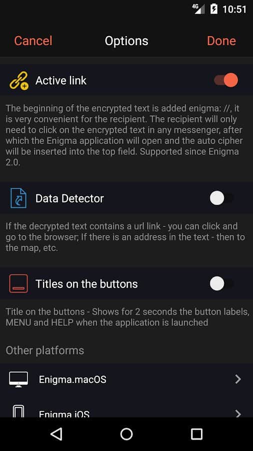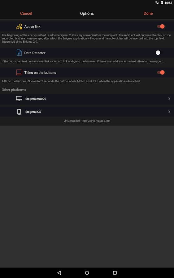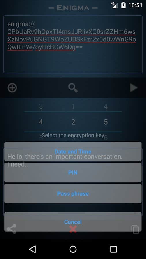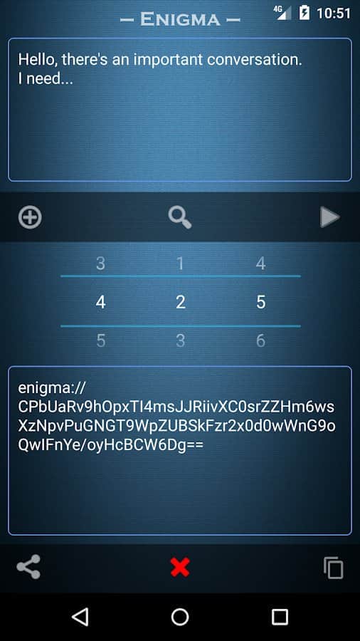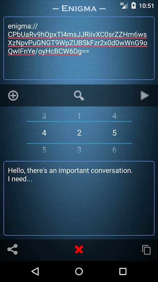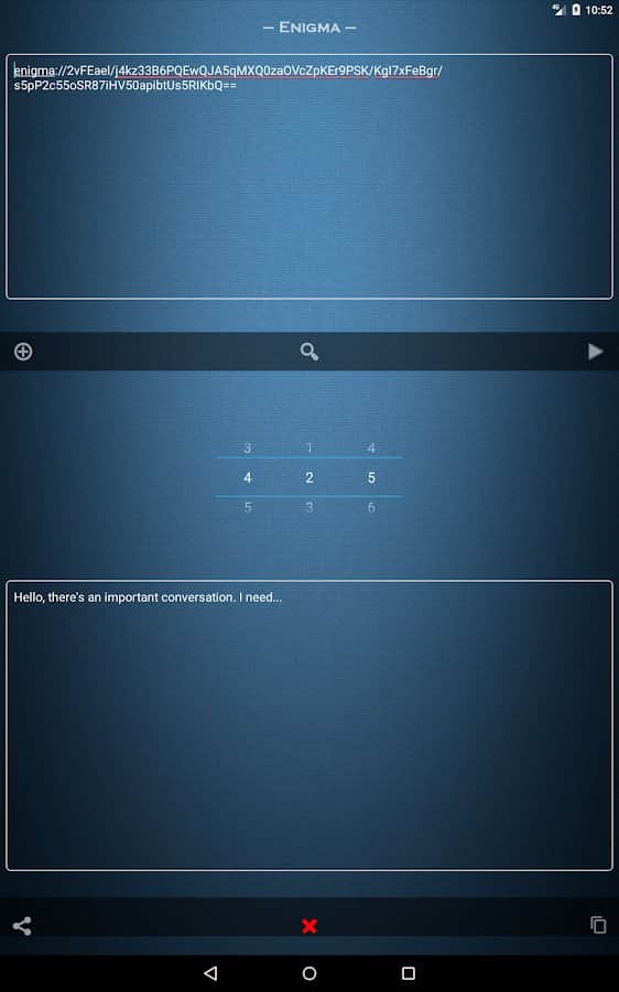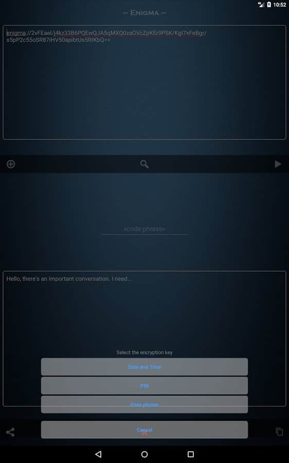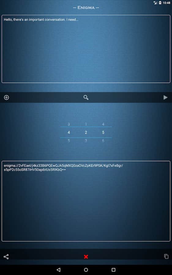 Enigma is an easy to use application that allows you to ensure the absolute security of any transmitted information. All you need to do is to make an agreement with someone that it will be used as your "Key" encryption. For example, it may be a three-digit number, the true meaning of which is clear only to you two. In the texts of encrypted messages allowed to use any characters, including emoticons. To crack such a message, not knowing "Key" and not having special education, is almost impossible. The resulting cipher is encrypted again.
