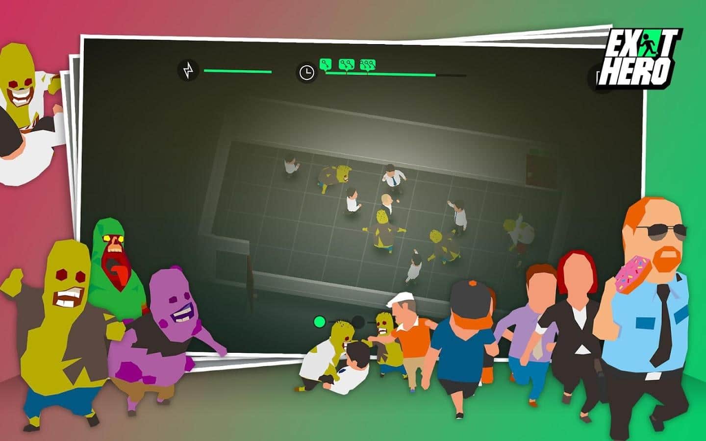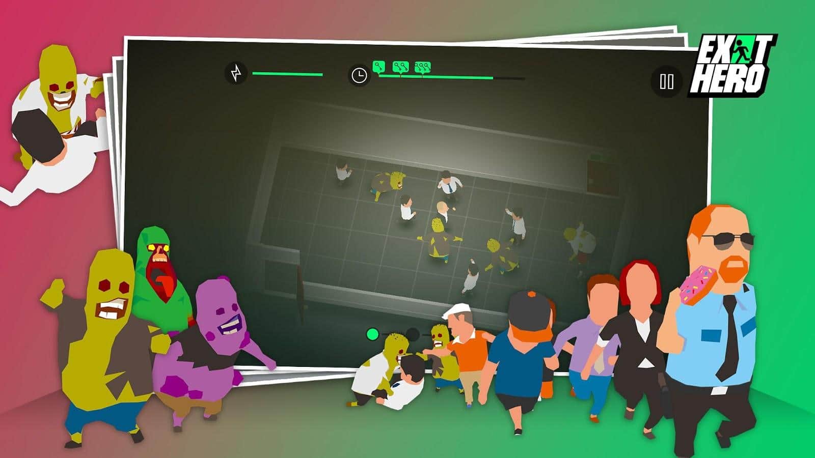 Exit Hero – fun game for Android where you will play the role of a guardian of a huge building where where nowhere appeared zombies. In this game your main task will be to bring people out of the building unharmed. Help frightened people and guide them according to numerous salons trying to move through empty cells that have no zombies. If you still encounter a zombie, use the force and become a super hero for their employees. On the way collect boosters and a variety of bonuses that will help you quickly pass the dangerous levels. Unlock all characters in the game, which is more than 30.