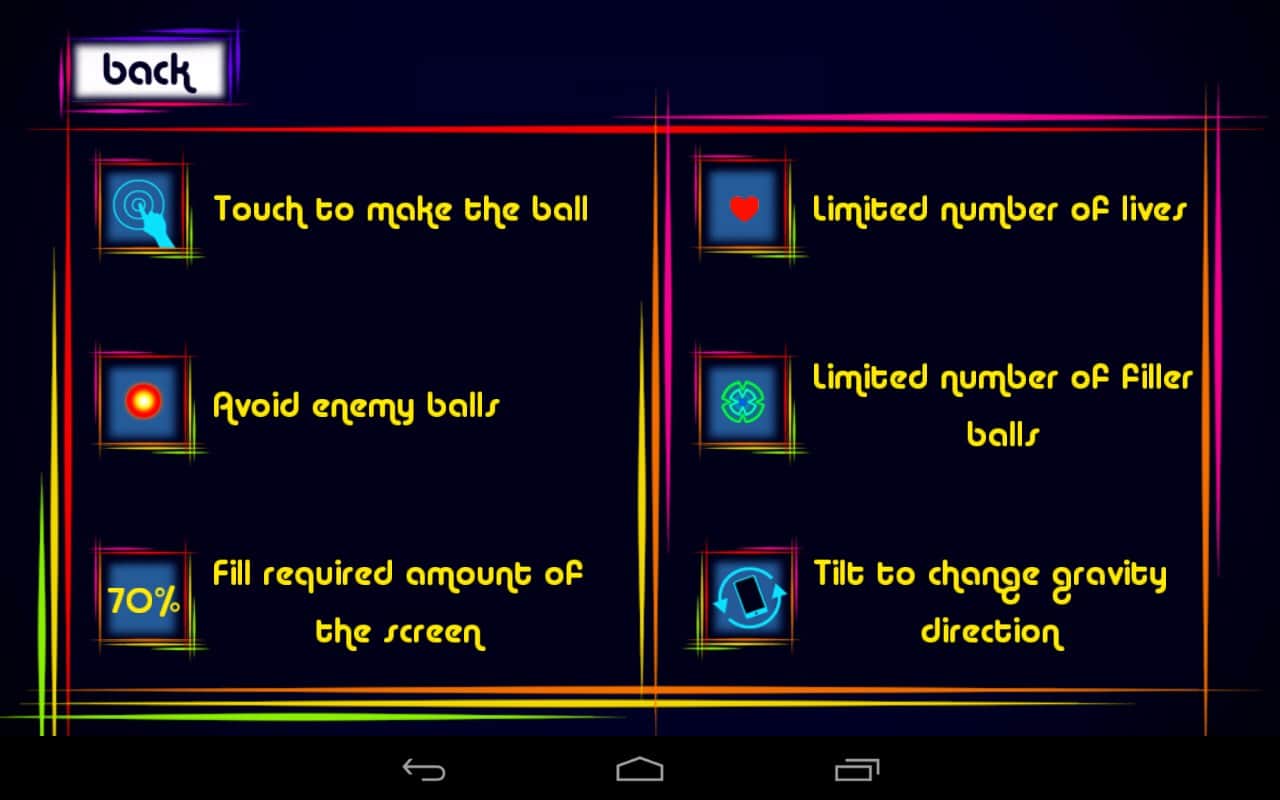 Filler Balls Saga - the game on Android in which you need to fill in the widening circles the entire playing area of the level. But just pass the level will not work, will not interfere with red dot, if the circle increases, you touch points, it will burst. You have a limited number to add circles on the level. Depending on how much the game is left unused for stars, you will earn stars. The game has over 500 levels and many different versions of the game.