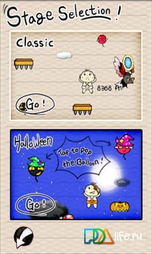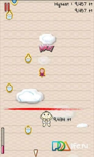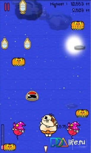 Fly Gaga — another variation of a platform for mobile the Bada OS, in which the player will jump higher and higher, simultaneously collecting bonuses and dodging objects, which will be forced to start the game from the beginning. You control the kid, who at the beginning of the game climbs on the trampoline and not without your help, jumps. The first jump is not very high and not dangerous, but with each jump height will increase, and the child can not do without your reaction. On his way up the trap in the form of a platform with teeth, black spheres and so much more. Do not forget to collect bottles of baby food - they will give Your hero strength and he will jump much higher.
