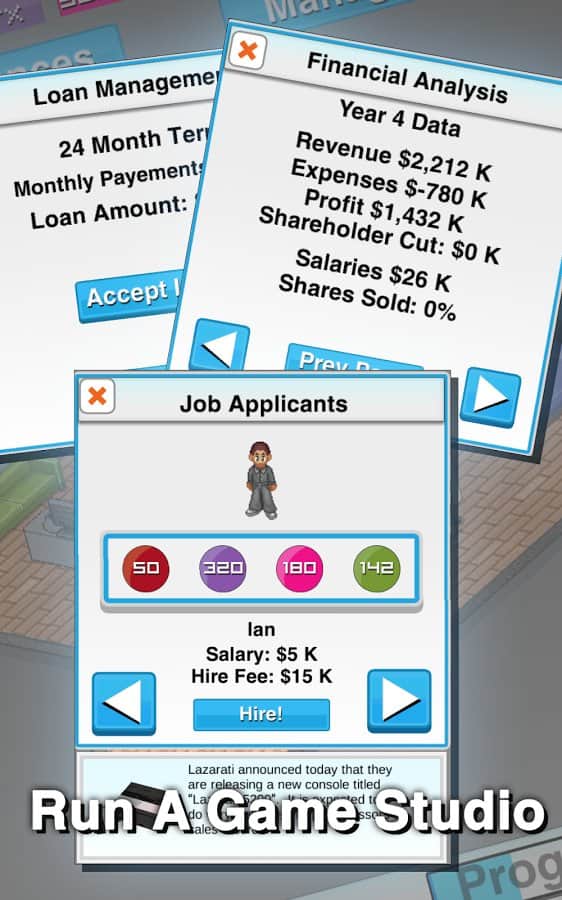 Game Studio Tycoon для Андроид это бизнес симулятор в котором вам предстоит взять под свое начало небольшую фирму по разработке программного продукта и привести ее на вершину игровой индустрии. Разработчики Game Studio Tycoon несколько отошли от привычных канонов бизнес симуляторов и ограничили временной промежуток игровыми 40 годами. За это время вам и предстоит развить свою империю. Для этого у вас будут все возможности, разработка игр на более чем 40 игровых платформ, найм и обучение персонала, заключение контрактов и остальные экономические аспекты, все это ляжет на ваши плечи. Как уже говорилось Game Studio Tycoon выполнена в ретро стиле и без сомнения придется по вкусу всем поклонникам этого популярного жанра.