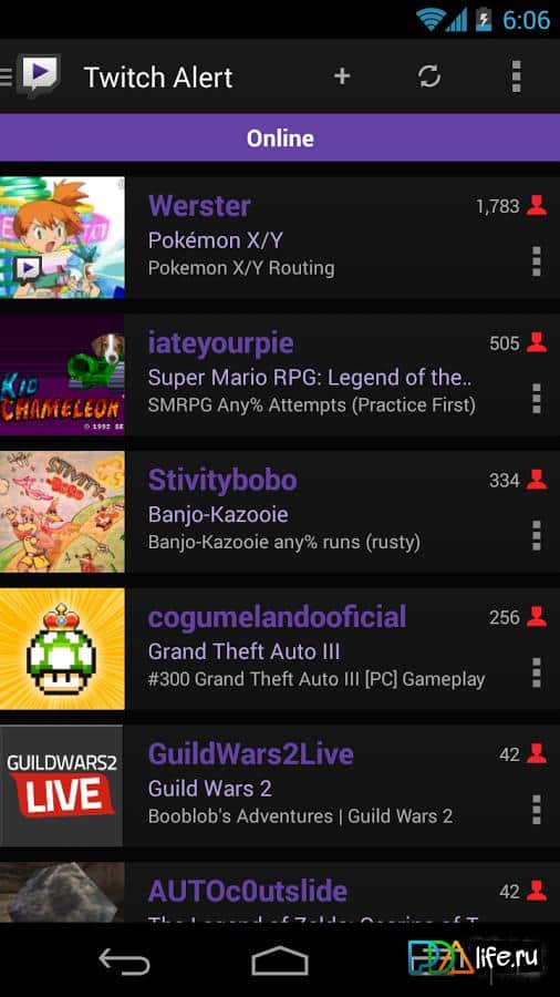 Gameplay Alert app for Android that allows you to view streams Twitch'a with the settings for your device. It is possible to watch streams in High, Medium , Low, Mobile; to chat with friends in the chat , with access to all the smilies and icons; notification of user status (online/offline), and much more.