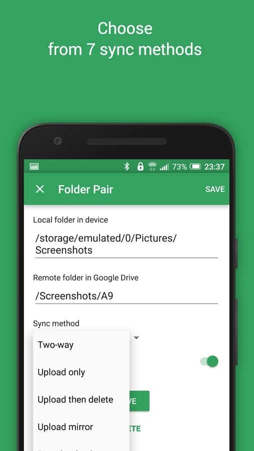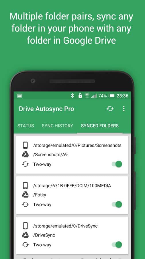 Google Drive Sync (DriveSync) is a good client for Android smartphones/tablets, providing their users full two-way synchronization with Google Drive. Interface, reliability, economical battery consumption and much more does not make you doubt in choosing the right program.