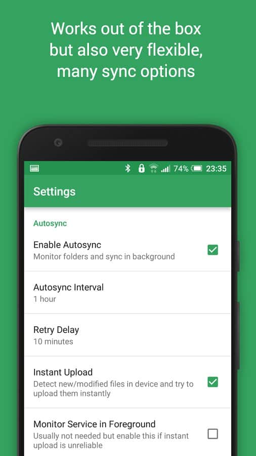 Configurable AutoSync interval: 15 minutes, 30 minutes, every hour.
