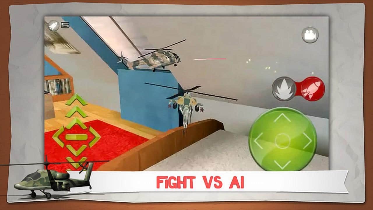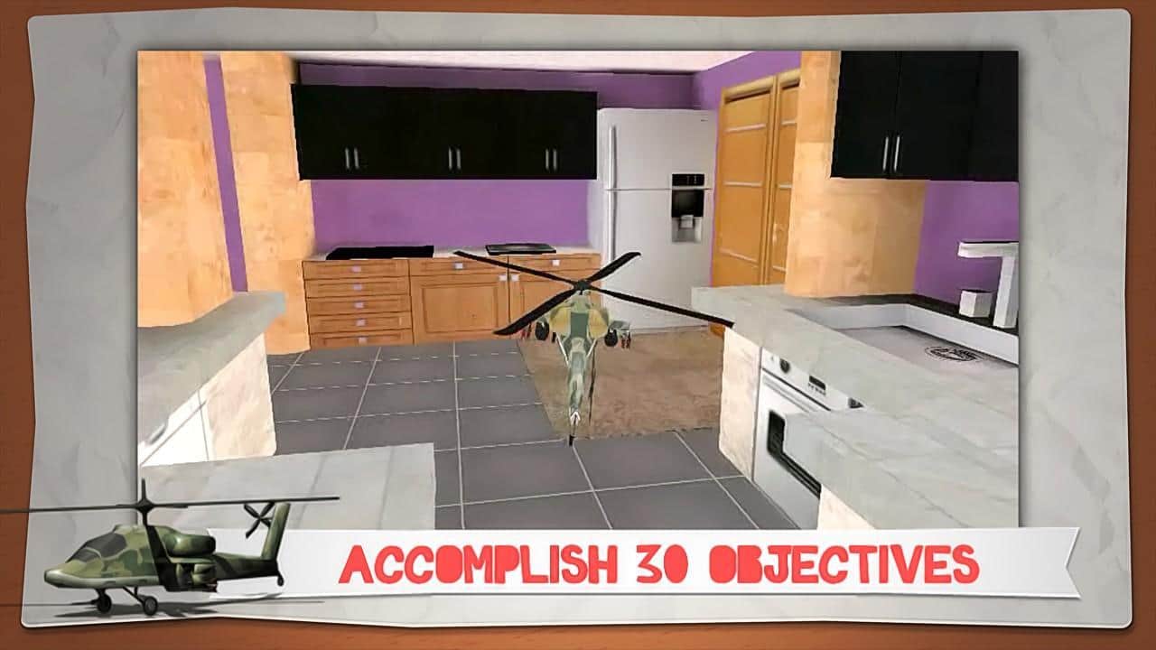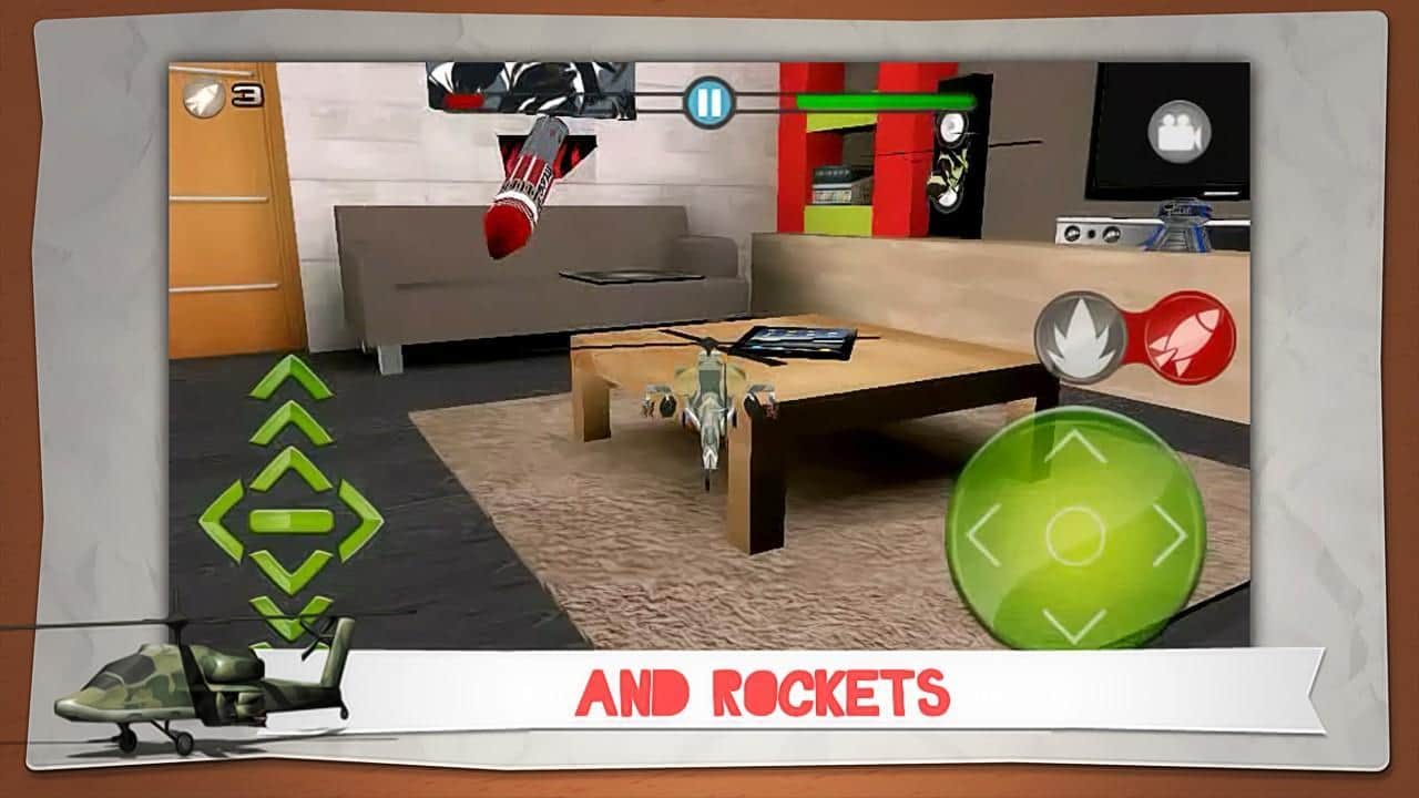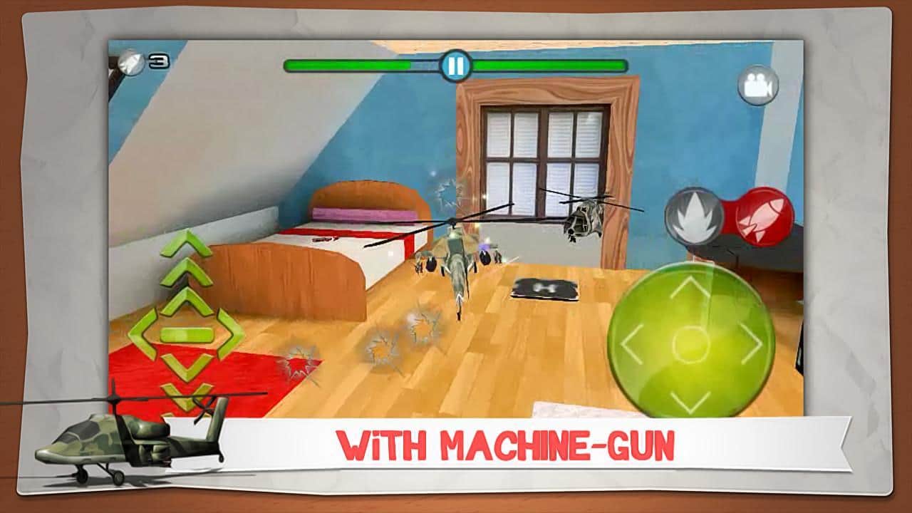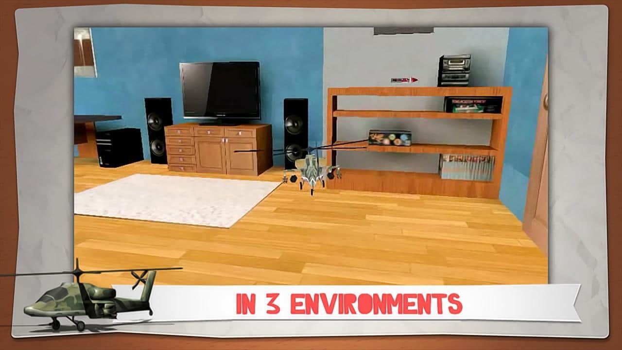 Helidroid Battle: 3D RC Copter - guide the helicopter right in the apartment - how? it's very simple - a toy helicopter under your strict guidance will fulfill all your instructions and tasks. On a choice there're 3 models of helicopter, the Apache, Comanche and Super Puma! Your location is 3 rooms - kitchen, living room and bedroom. You can fly in free mode or mission mode (30 jobs). Each level increases the difficulty and there are new elements. Destroy your opponent in a fair fight and unlock new game features!