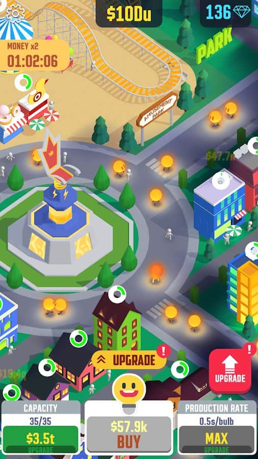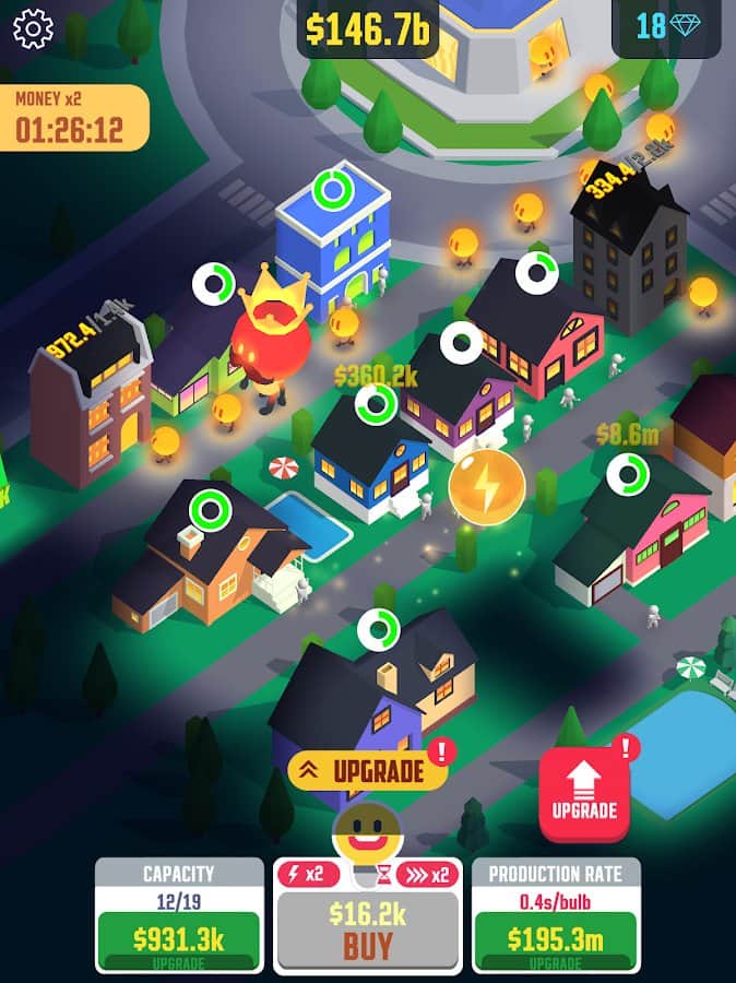 Idle Light City - one day, for unknown reason, a huge city plunged into darkness. On the streets there is no light, as the sun seemed to have forgotten about its existence. You have to help the city out of the darkness, shed the light on its beautiful homes, amusement parks, factories and shops. Light every corner of the town and earn more and more money. At your disposal is an entire factory of light bulbs, click on the screen to produce more. Buy upgrades for your cities and factories, expand the area to produce more light bulbs and show the world what a great city lies in darkness.
