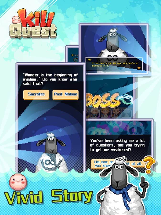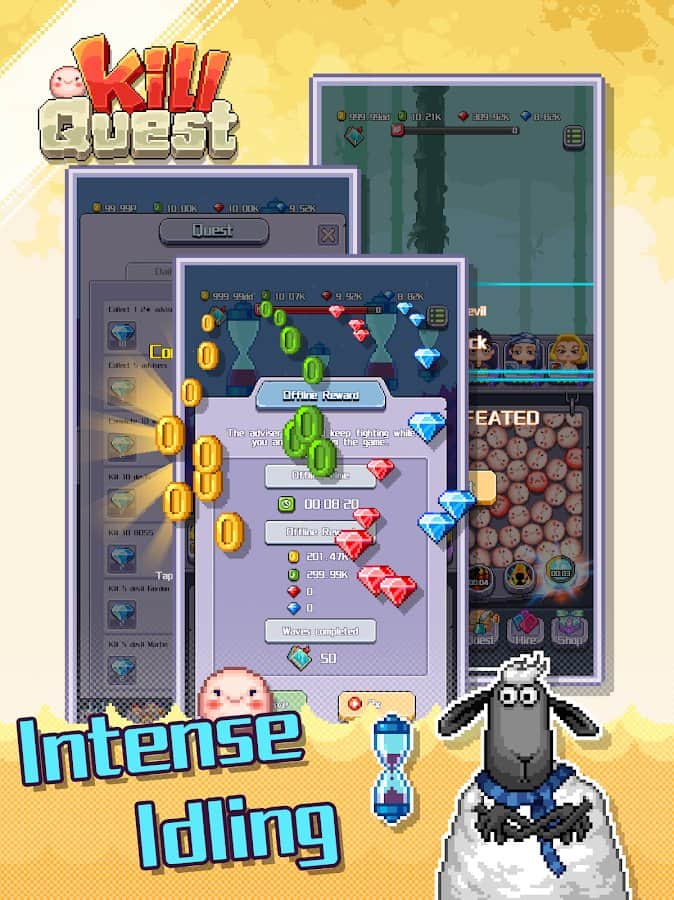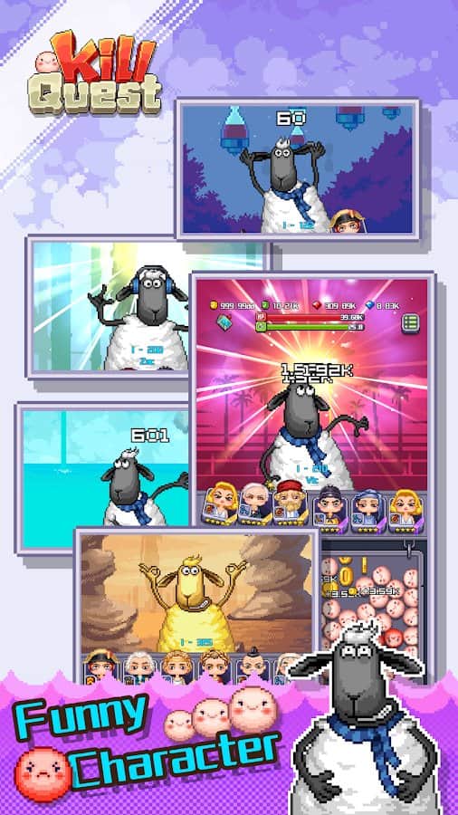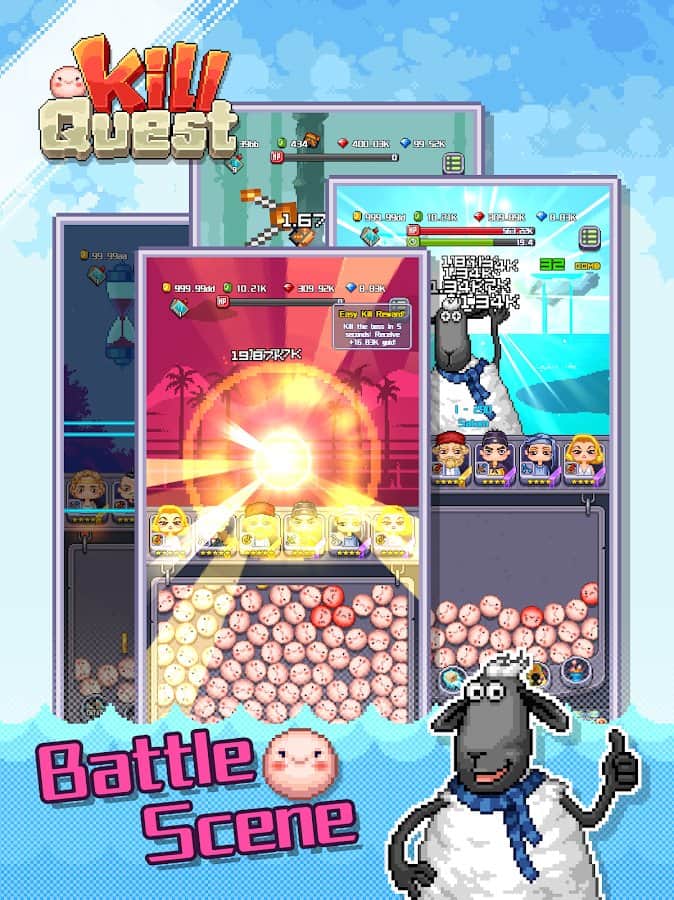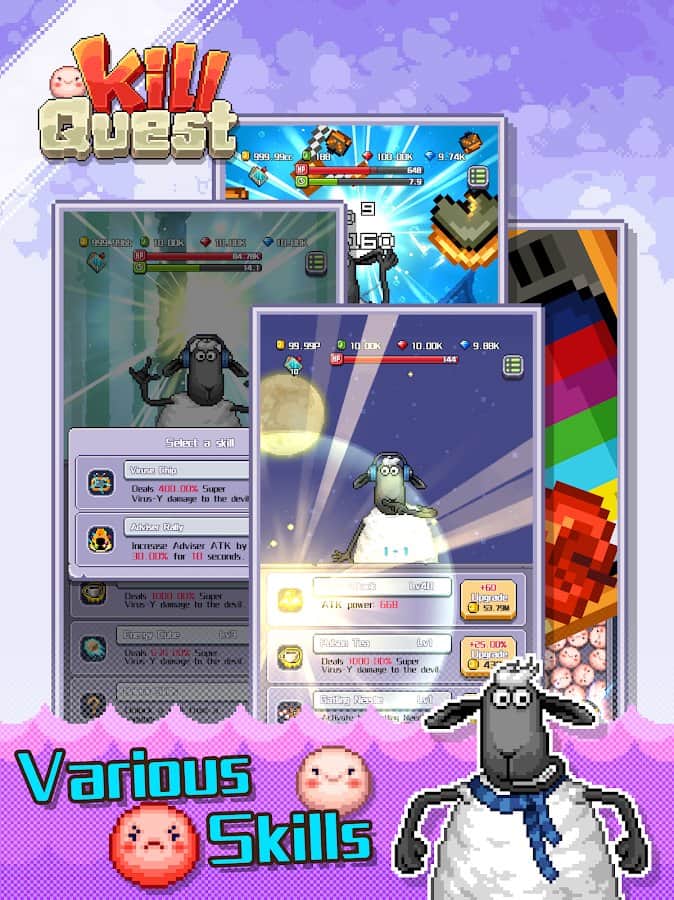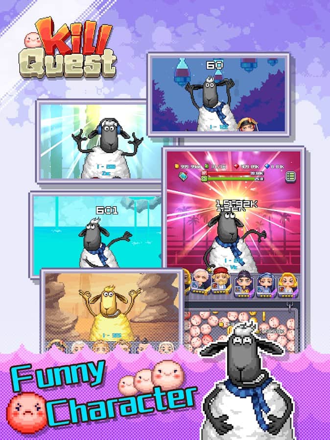 Kill Quest Once funny sheep have revealed to you some secrets with which you have to complete all the tasks and to solve puzzles. To find out the truth about this world, just watch out for interesting stories, unlock skills and unleash their magical abilities. Create a team of 6 consultants that will help in performing some tasks. Get rewards, even in offline mode, despite the fact that you are out of the game. Learn all the secrets, along with the animated characters in the game!