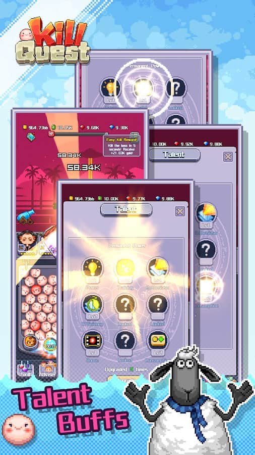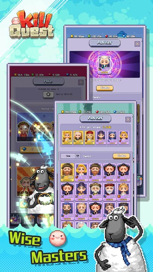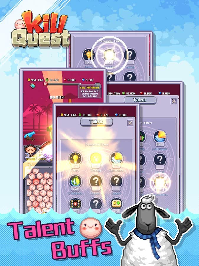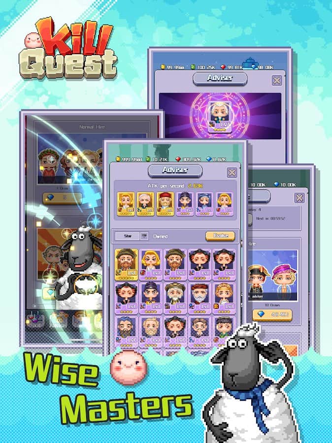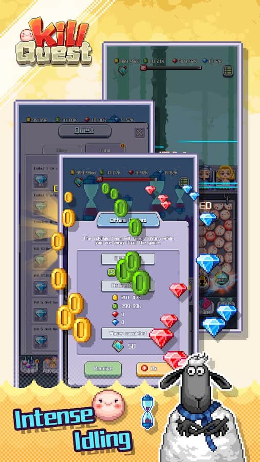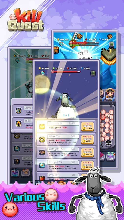 Kill Quest Once funny sheep have revealed to you some secrets with which you have to complete all the tasks and to solve puzzles. To find out the truth about this world, just watch out for interesting stories, unlock skills and unleash their magical abilities. Create a team of 6 consultants that will help in performing some tasks. Get rewards, even in offline mode, despite the fact that you are out of the game. Learn all the secrets, along with the animated characters in the game!