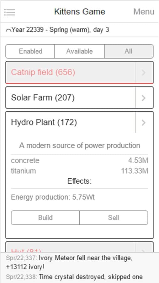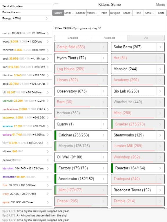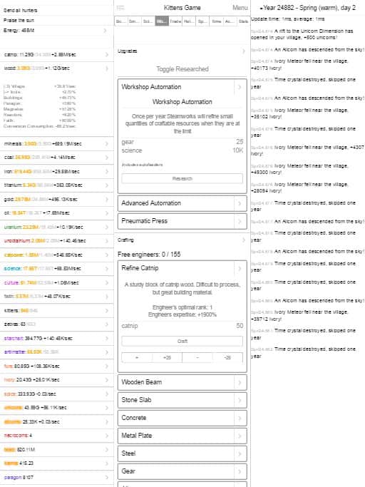 Kittens Game - text strategy in which you have to go to a magical world of seals and take control of a small village of furry fun. In addition to the construction of buildings and control the use of resources you will explore new technologies and ultimately to send cats to the moon. The difficulty of the game is the huge amount of content at your disposal will be more than 30 buildings and 50 kinds of resources, using which you will learn about and use new research, the number of which is a huge number.