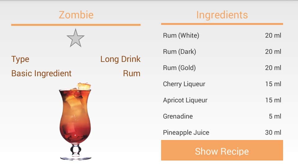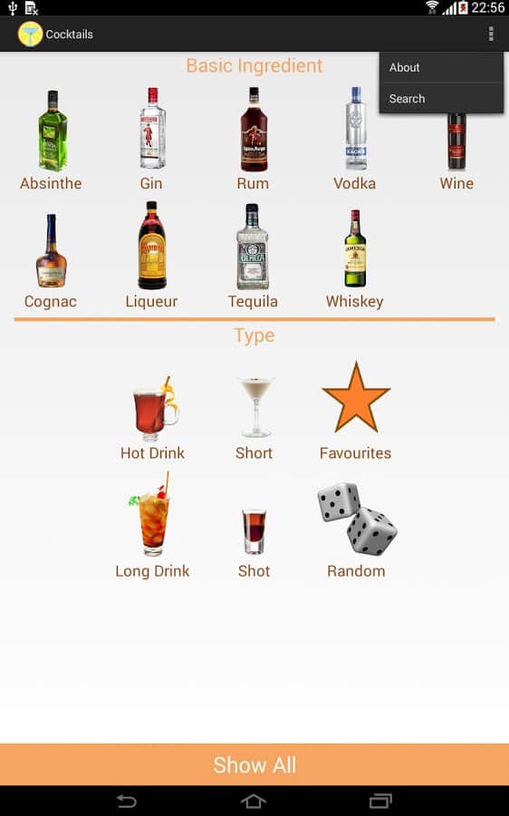 В приложении все предельно просто: поиска как такового нет, но можно воспользоваться сортировкой по типу коктейля или его компонентам. Определившись с напитком, переходите к странице с фотографией, компонентам и подробному рецепту.