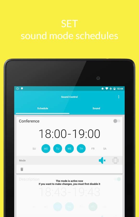 It often happens that we set a specific mode on your smartphone or or tablet at regular time. And each time forced to Tinker with the set the same settings. Or, even more often, including, for example, silent mode, forget to turn it off and miss important calls. To avoid such embarrassment and just don't spend a lot of time in the same type of action, you can use the provided app. It allows flexible and extremely fine-tune all the audio settings on the device, turn on time and turn off the setting, and thus saves the owner a lot of time. The app interface looks simple and, thanks to Material Design, modern.