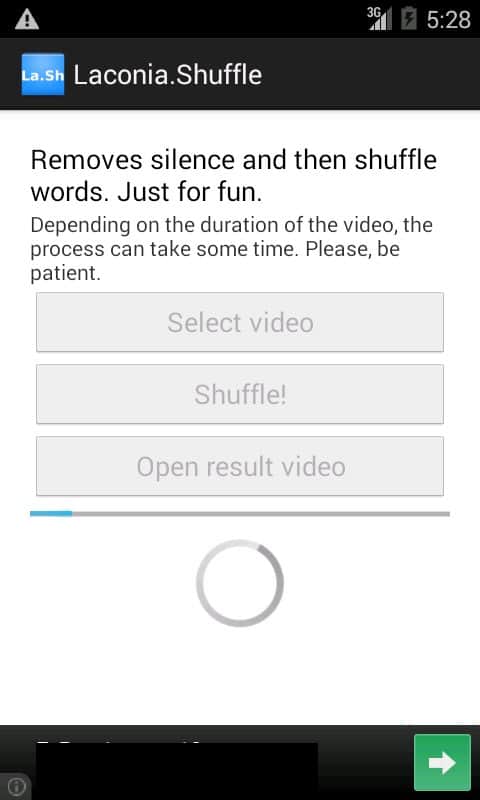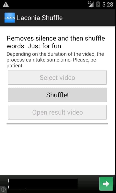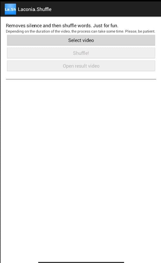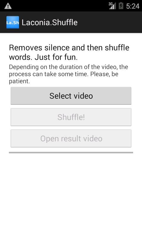 Laconia.Shuffle – application for fans to experiment with video records from the developer NIKNAMELOGIN for Android. With this program you can not only remove the silence in the video (it's worth noting that this is done automatically), but also to hold a number of different effects, such as the pronunciation of the words backwards or at all to mix up all the words. One of the highlights of the program – is the fact that the video is processed directly on your device without uploading to the Internet, which makes your video file, your. Enjoy and good mood!.