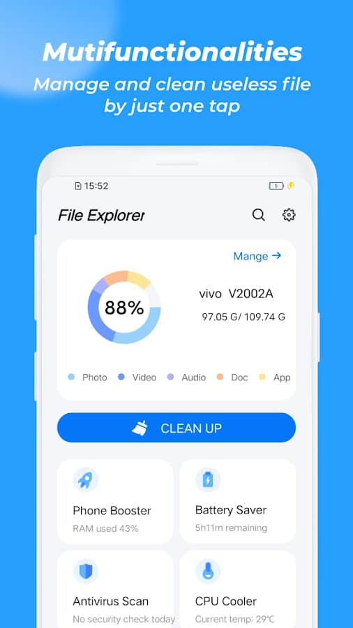 Clean up garbage and unnecessary files and optimize the operation of your device with the Laser File Explorer application. Features: Powerful file cleaner, Built-in application manager for easy management, Acceleration of the device, Scanning and deleting virus files, PROCESSOR cooler, Clearing the system cache, Protection against interruptions, Sorting programs by category, Quick search for the desired file from internal memory or SD maps, Battery saving, Closing programs running in the background, Easy operation and automatic mode.
