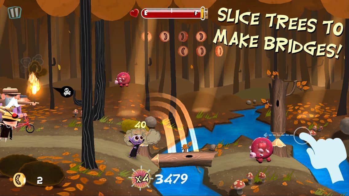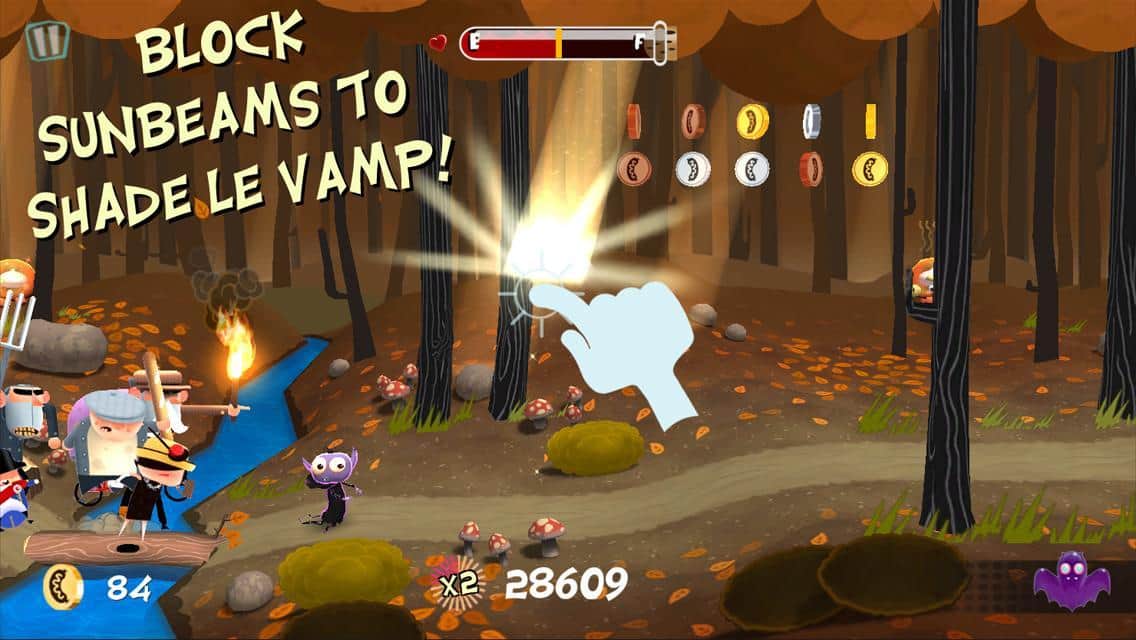 Le Vamp is a bright arcade game for Android in which you play as a little vampire, who goes through the woods. His journey is not so safe, so without your help he can not do! Overcome obstacles together, sawing the trees to pave the way across the river, protect the vampire from sunlight, feed the baby piglets. In addition, collect bonuses and cope with enemies! In General, you won't be bored!