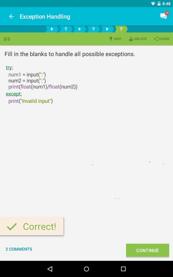 Learn Python - No, you never need to learn Python. This is not a game but an application that will help you in learning such a programming language as Python. It was done with the goal to facilitate people's problem, because if you study his books, all this can quickly become annoying, and very difficult studied. Therefore, the authors of this application provided all of this in a game. You have to perform tasks in exchange for points. And in accordance with the points of the task will become more difficult, and you will begin to learn new tasks. This is not an advanced course of programming, just learning the basic functions that will help you get comfortable.
