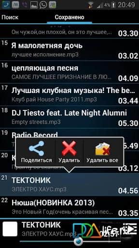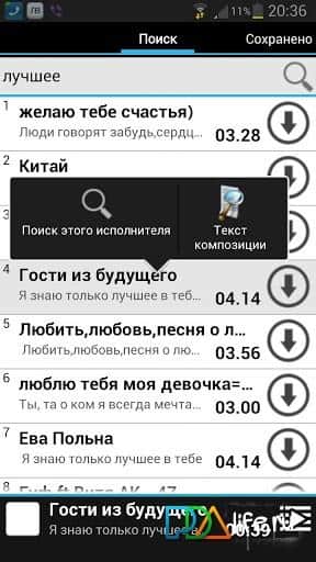 Lovi Vkontakte - cool Android app for fans to listen and download music from social network Vkontakte. At your disposal the ability to quickly find and listen to without the Internet anywhere and at any time. To search for a desired song you need to enter the part name in the search box, and download click on the arrow in the circle. Save tracks on the memory card or internal memory of your device. Also you can send stored music to send to your friends via E-mail, imo, Viber, Jabber, WhatsUp, Bluetooth, WI-FI Direct. The app works through your page Vkontakte, so if you have not registered in this social network, do it through the app Lovi Vkontakte .