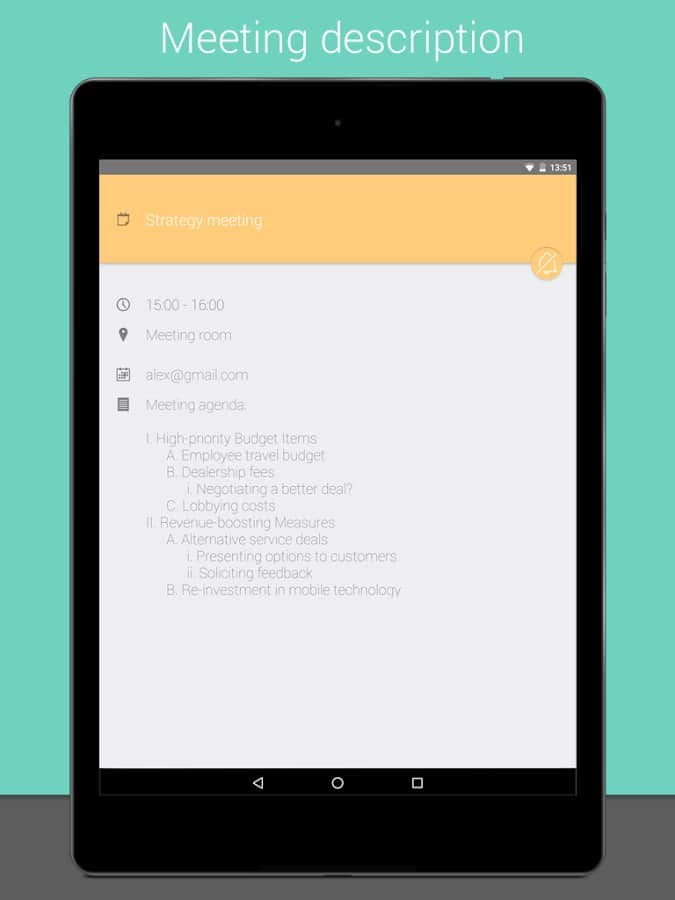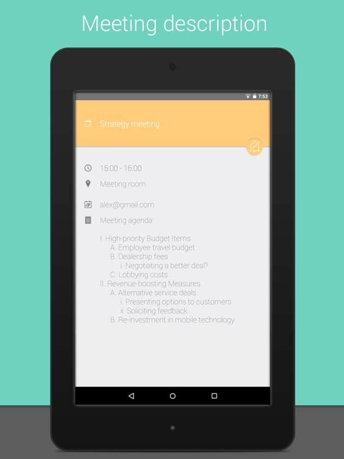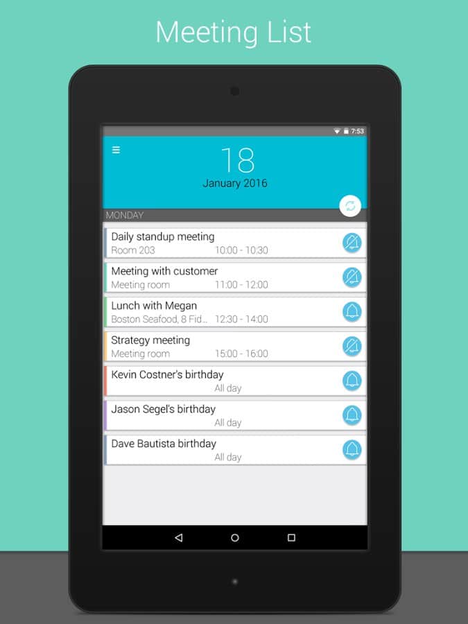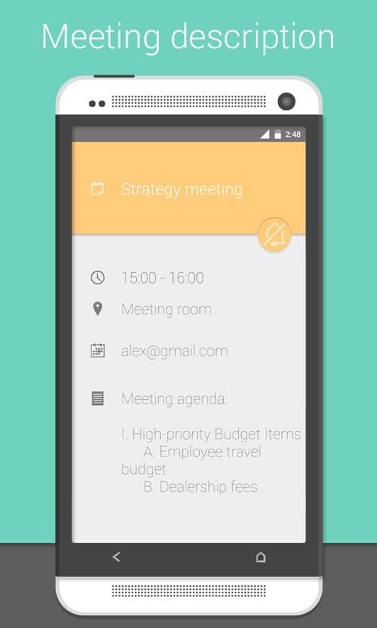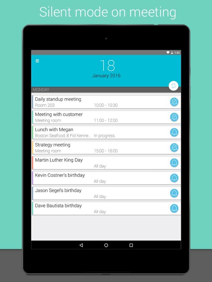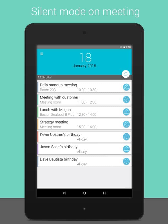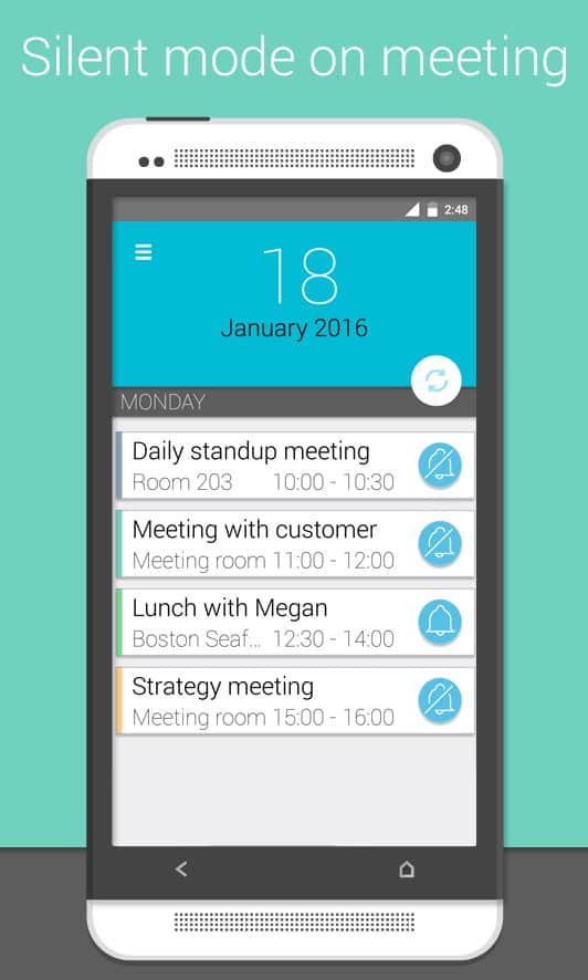 Meetings - a Very curious application that helps you organize your day. At first glance you might think, well, Yes, calendar, Yes list of meetings and the time, but it already was! And here and there, unique feature of this app is that you can set the sound your phone at a certain time. For example you are a student, or you have a business meeting, and the sound is off you forgot, and you're in an awkward situation, and your image is ruined. So, this app will deprive you of such embarrassments, it will sound off at a specified time, and then after a certain period to turn it on. You choose all the settings time and therefore, even if you forgot your mobile, you can not worry that the sound of a sudden call will spoil your business meeting.