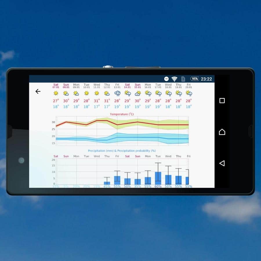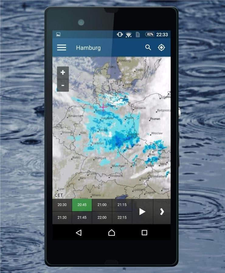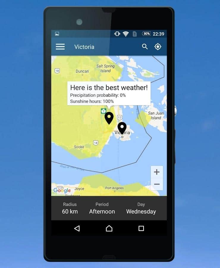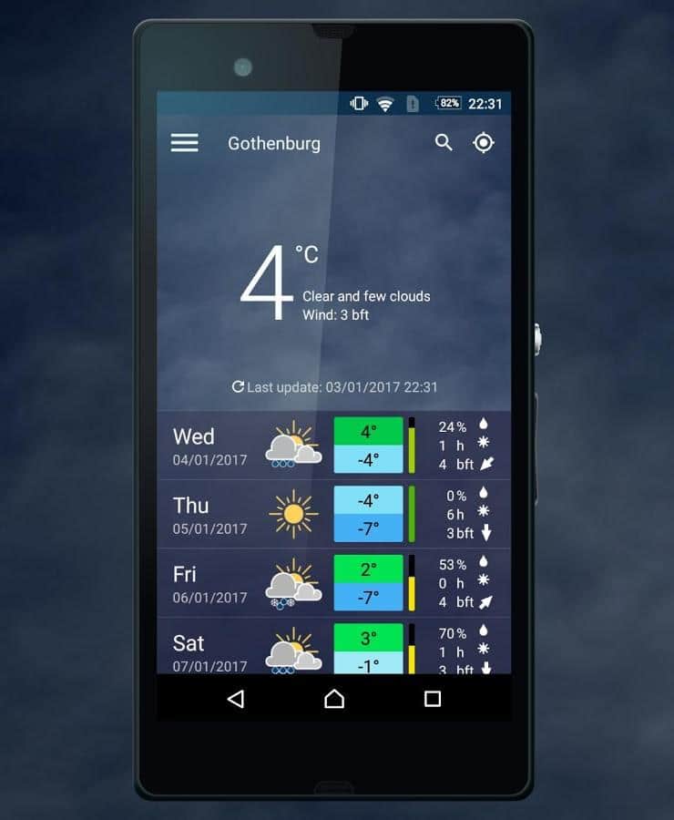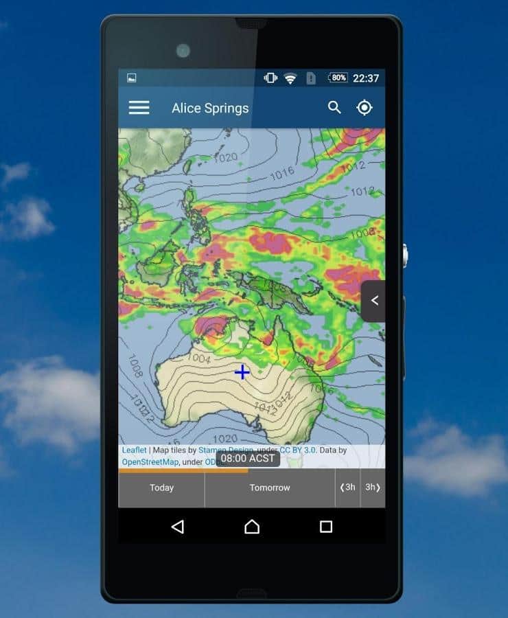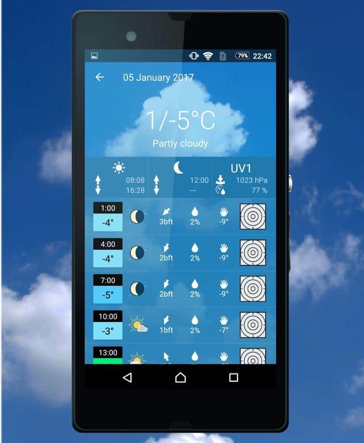 Meteoblue Is a very simple application for viewing weather. It is very different than what you saw, because the main part of the program is a simple display of temperature, wind speed and pressure in your area. The developers of this application went ahead and made a map with these methaodne, you will be able to see how moving wind, what is the difference in temperature over different regions and more, all conveniently shown on the map. If you like a simple prediction, you can simply choose the desired city.