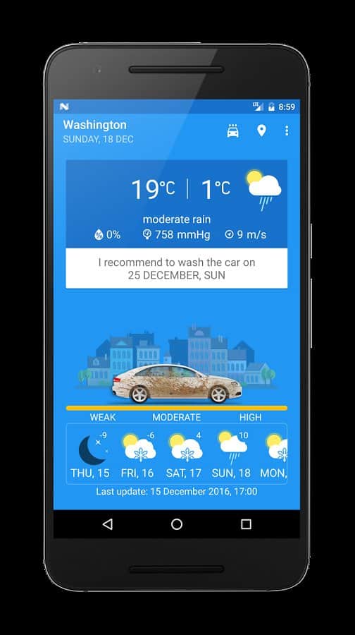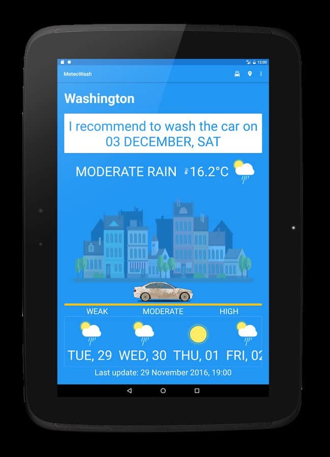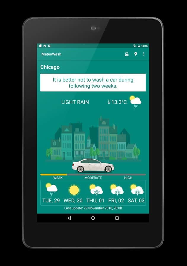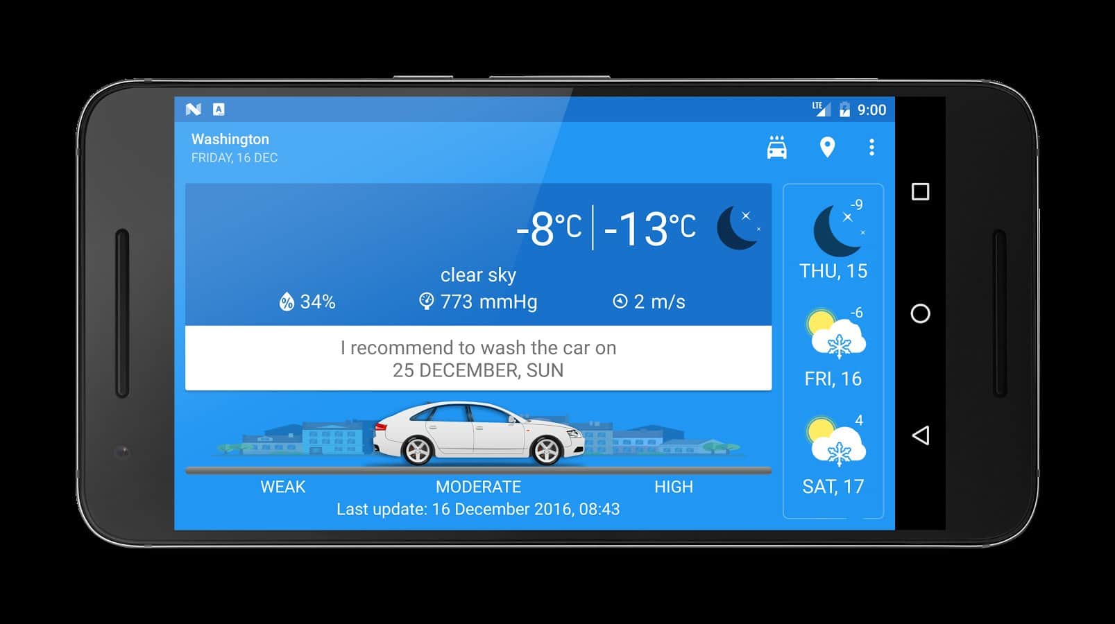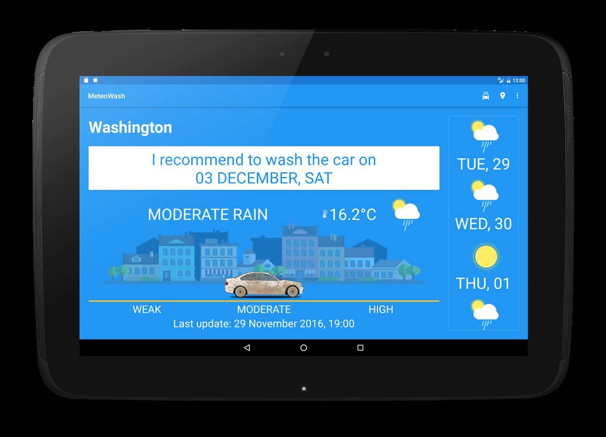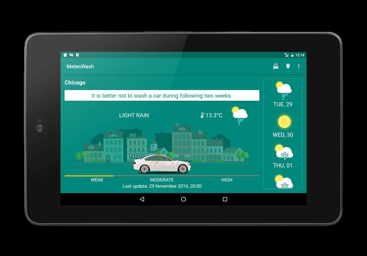 MeteoWash - nearest car washes all had such a stupid situation when you are left with car wash, then it started raining. This app was dedicated to motorists, and those who think him to wash the car today or not. The essence of the application of course is very simple, and is that shows the weather forecast. However, the main emphasis here is made on whether precipitation will fall or not. In addition, directly in the app, there are a bunch of different addresses of car washes and their numbers.