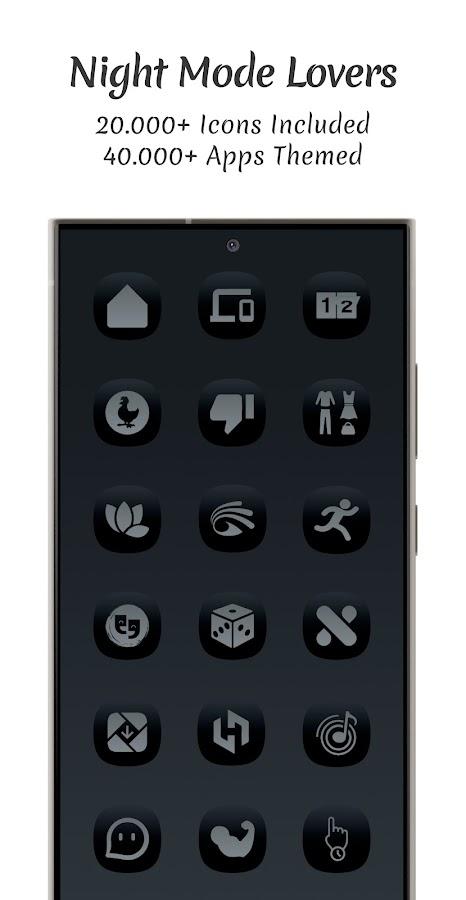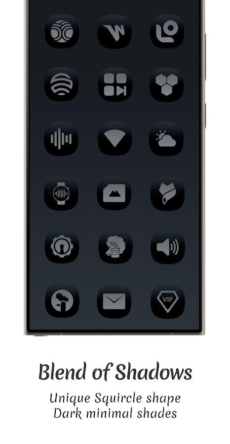 Midnight Dark Icon Pack — an exclusive icon pack where square shapes seamlessly blend with round ones, creating a harmonious and modern look. Dark gradients give the icons depth and contrast, making them perfect for nighttime themes on Android devices.