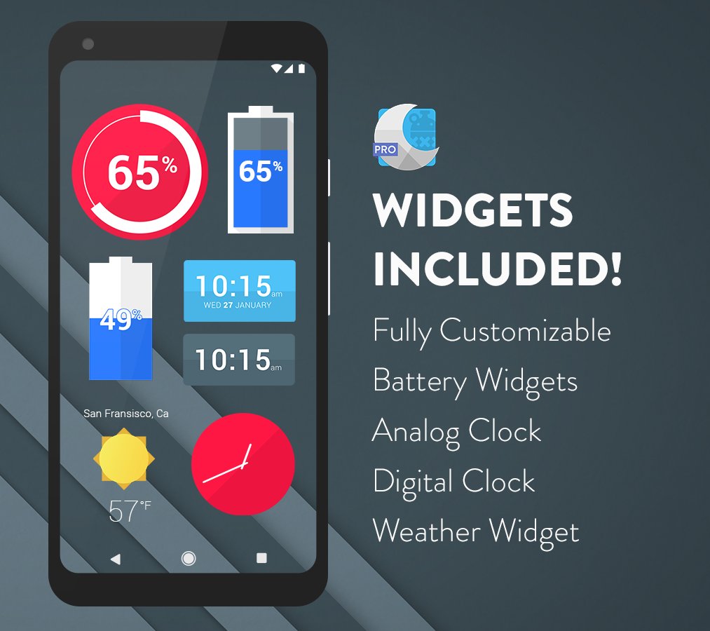 Complete style: 100+ exclusive Material wallpapers and custom widgets (clock, weather) for a cohesive appearance.