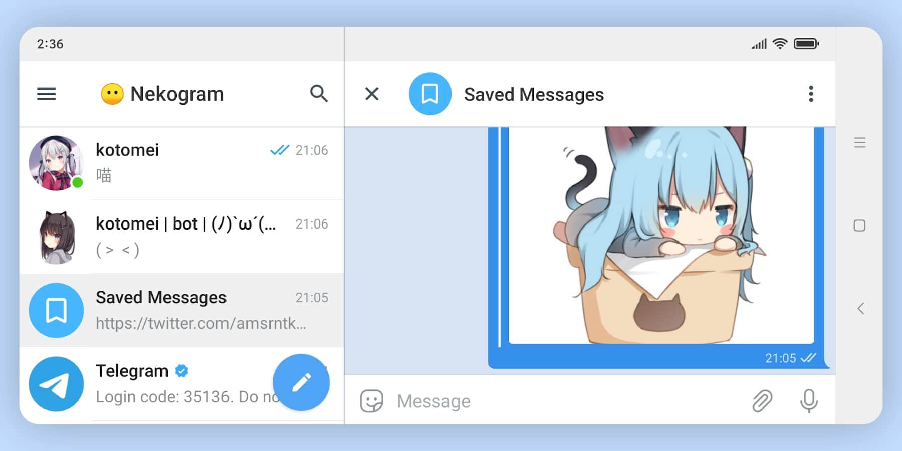 & lt;p & gt; With the Nekogram app, you can get several significant additional features to use the Telegram messenger. Among the advantages, you can note the following: repeat messages from other users or personal ones, the ability to save the necessary message in a special section, and make a transfer without quoting the message. Configure alerts using the recipient ID, manage provider functions for group chat preview, promote or restrict a specific user using the context menu. It will be easy for you to manage downloaded files, customize stickers, stickers, etc., export and show chats and messages.