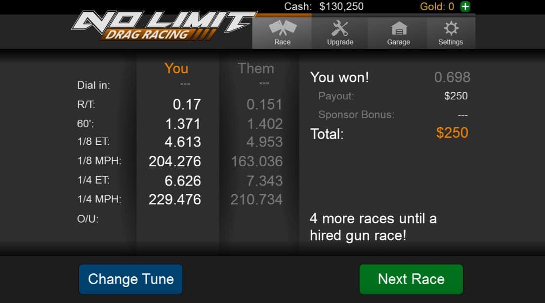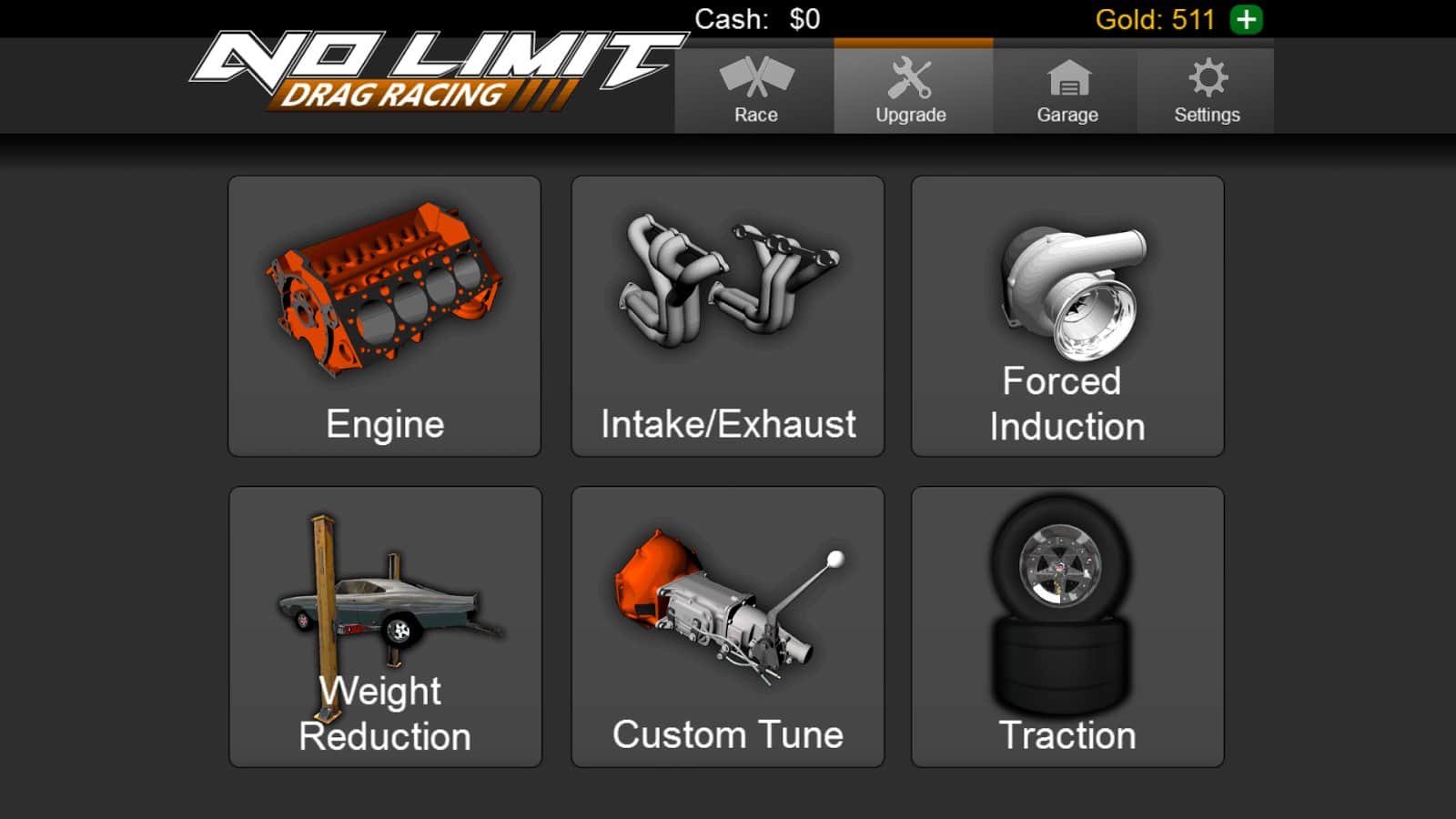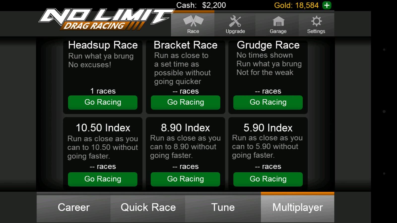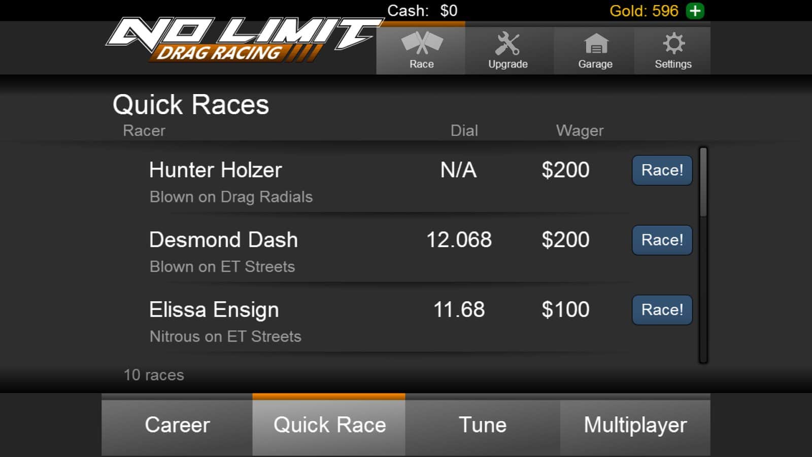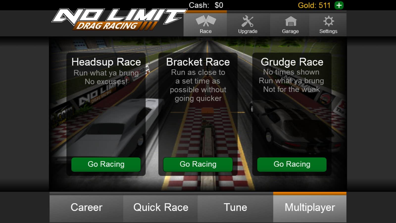No Limit Drag Racing - Замечательные гонки на андроид в стиле драг. Вас ждет несколько десятков автомобилей с возможностью настройки и улучшения. Становитесь на старт, прогревайте резину, и начинайте увлекательный чемпионат в мире драг рейсинга. Игра выполнена в довольно простом формате, поэтому она подойдет даже для слабых устройств. Также из небольших минусов можно отметить отсутствие русского языка.